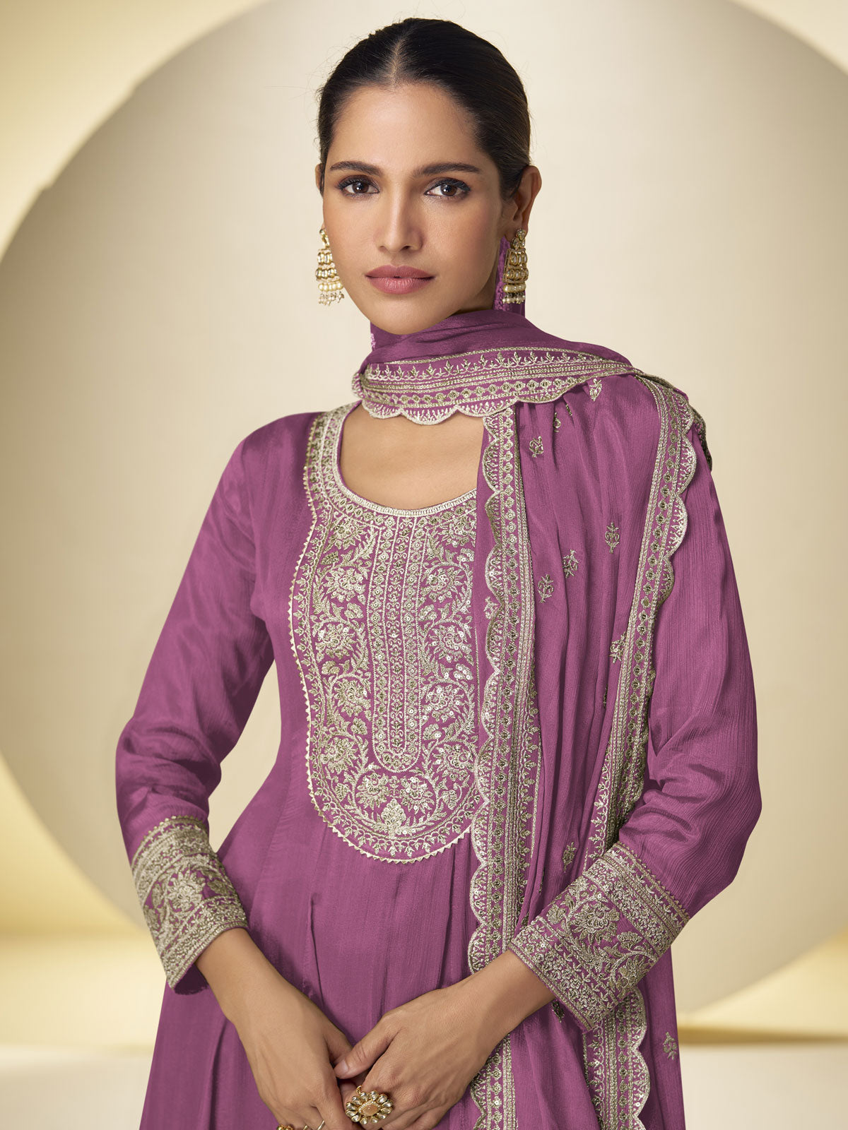 Celebrate in style with this exquisite Onion Pink Palazzo Suit from Inddus, expertly tailored from luxurious real chinnon silk. The ensemble showcases meticulous sequin and thread embroidery work that imparts an understated luminescence, making it an exceptional choice for weddings, receptions, and festive occasions. Each piece—the intricately embellished kurta, coordinating palazzo trousers, and flowing dupatta—has been thoughtfully designed to harmonize seamlessly. This sophisticated ensemble masterfully marries traditional Indian craftsmanship with contemporary aesthetics, offering versatility across multiple celebratory events. Elevate your look with complementary jewelry and accessories to complete this refined festive ensemble.