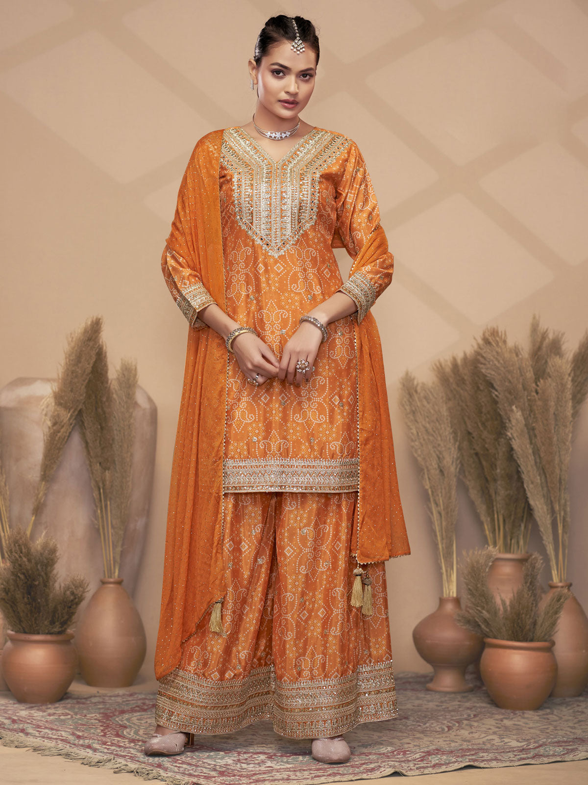 The Orange Chinon Bandhini Print Embroidered Sequins Palazzo Suit seamlessly merges traditional craftsmanship with contemporary elegance. This festive ensemble features premium chinon fabric, renowned for its luxurious drape and breathability, making it ideal for extended wear during celebrations. The thigh-length kurta showcases a refined V-neckline embellished with mirror work and sequins that complement the authentic bandhini print, while the high round back neck provides structural sophistication. The relaxed silhouette ensures unrestricted movement without compromising on grace. Paired with palazzo pants, this versatile piece transitions effortlessly from formal gatherings to semi-formal occasions, offering both comfort and timeless style rooted in Indian textile heritage.