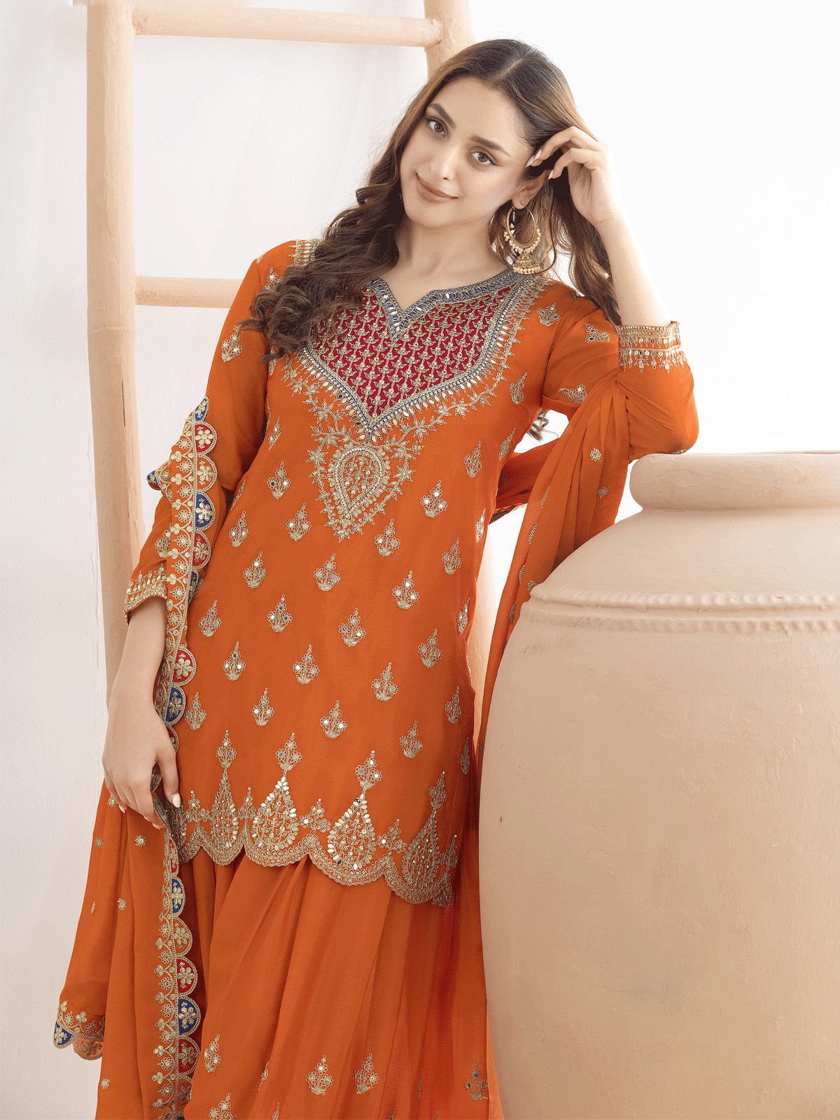Experience timeless elegance with this Orange Premium Chinnon Silk Palazzo Style Suit from Inddus. Meticulously crafted from luxurious chinnon silk, this three-piece ensemble showcases intricate dabka dori, shimmering sequins, and handcrafted mirror embroidery that captures light beautifully. The heavily embroidered top pairs seamlessly with the flowing palazzo bottom, while the coordinating dupatta completes the sophisticated silhouette. Each detail reflects traditional artisanal craftsmanship, making this the perfect choice for weddings, receptions, and festive celebrations. Elevate your occasion wear with this statement piece that combines heritage techniques with contemporary style.