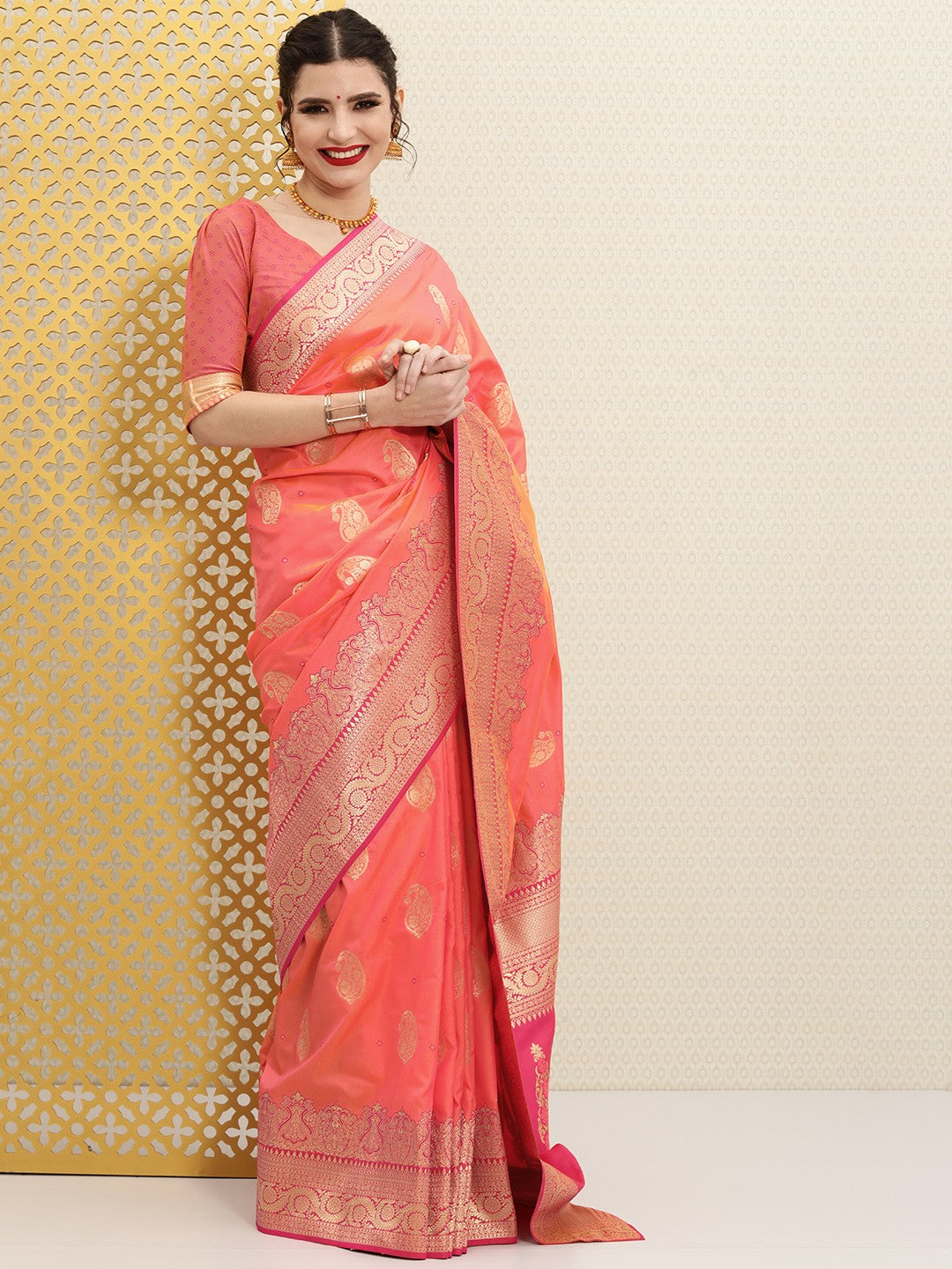 The Orange & Golden Paisley Woven Design Dual Tone Jashn Banarasi Saree is the perfect choice for a classy and elegant look. This saree features a mesmerizing paisley woven design with intricate zari detailing on an orange and golden dual tone fabric. Complete your ensemble with the included unstitched blouse piece.