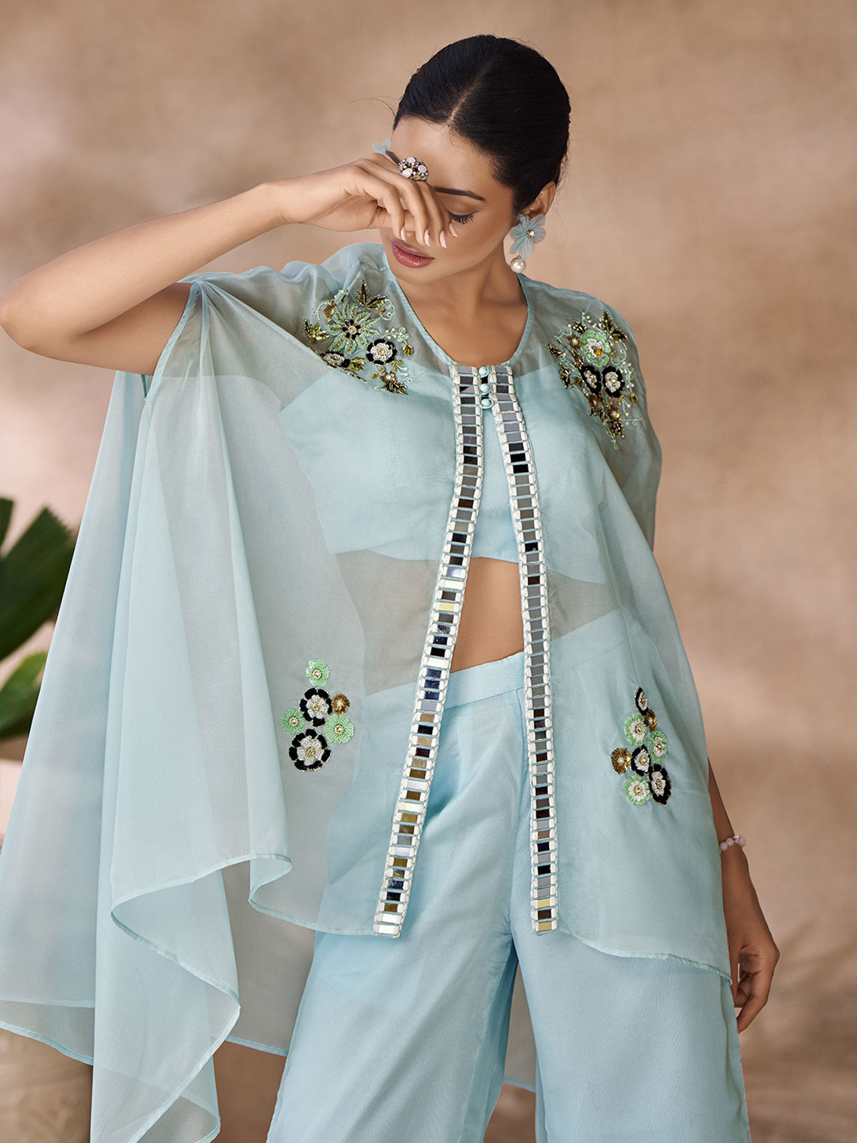 Experience the epitome of style with our Organza Sequins Party Wear Kurti in Aqua Blue. Made from high-quality organza fabric, this kurti features intricate sequin and thread work, making you the center of attention at any party. With slight variations in color, fabric, and work, each piece is unique.