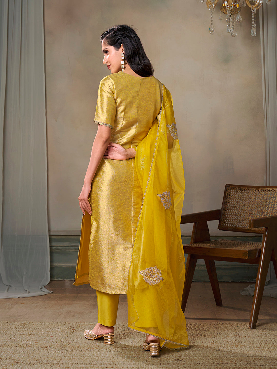 This mustard yellow kurta set features a beautiful paisley woven design, crafted from high-quality silk blend fabric. The kurta has a regular straight shape with a round neck and short sleeves, while the trousers are solid and partially elasticated for a comfortable fit. The set also includes a dupatta for a complete traditional look.