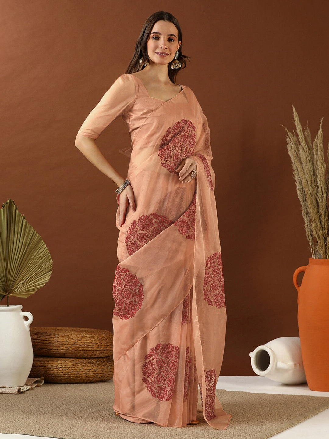 This elegant Peach Floral Embroidered Organza Saree features intricate floral embroidery and a solid border in stunning peach and maroon hues. Made from lightweight organza, it offers both style and comfort. Comes with an unstitched blouse piece for a versatile and customizable look. Make a statement with this timeless piece.