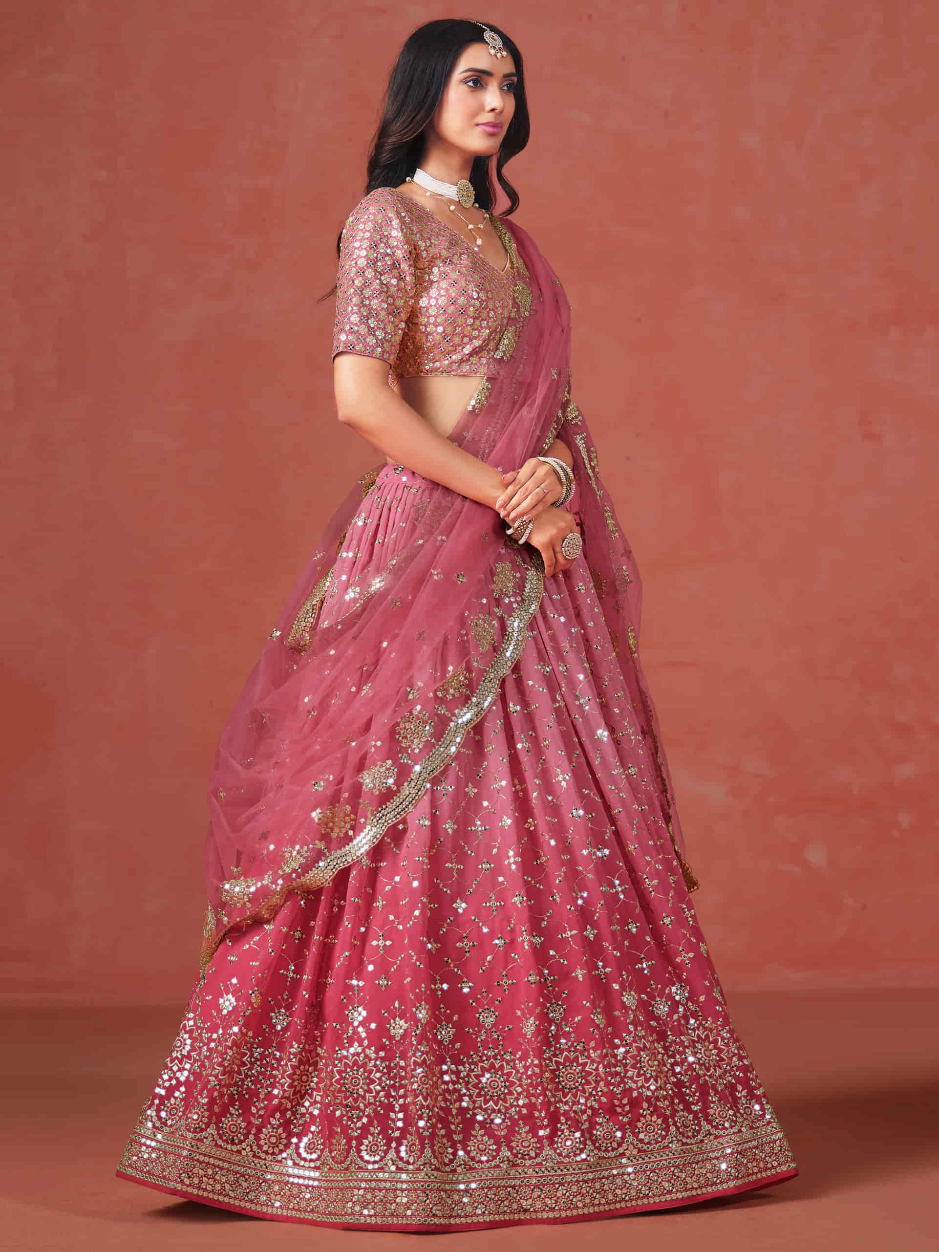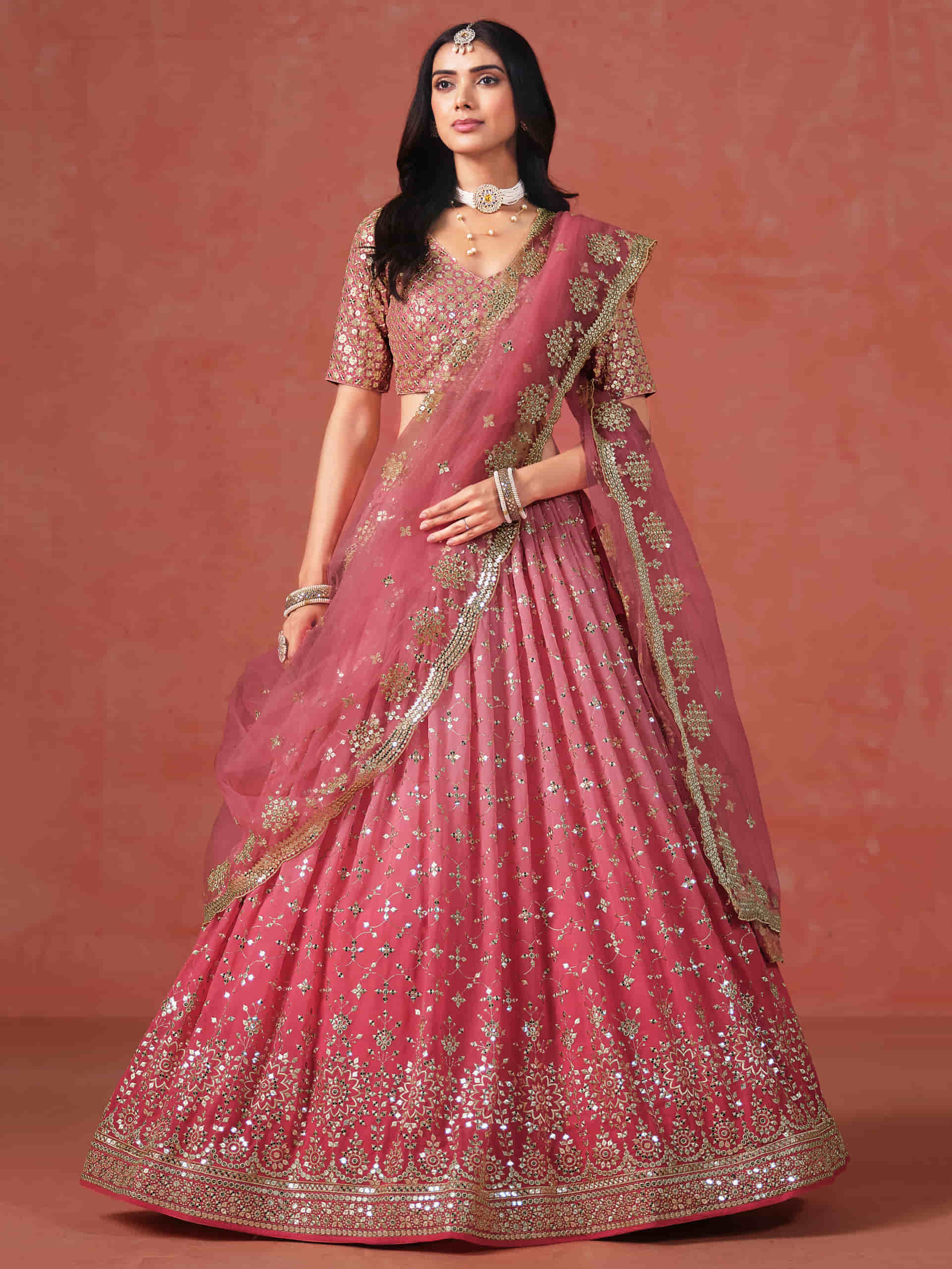 The peach lehenga in two-tone georgette is adorned with zari embroidery, sequins, and stylish latkans.