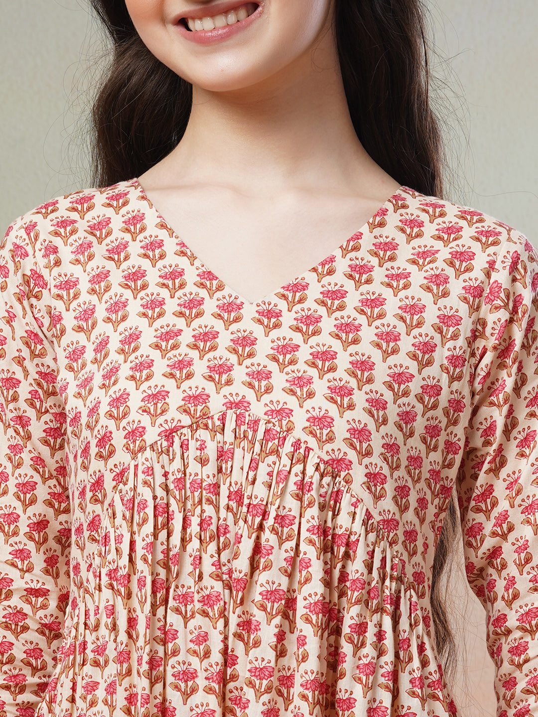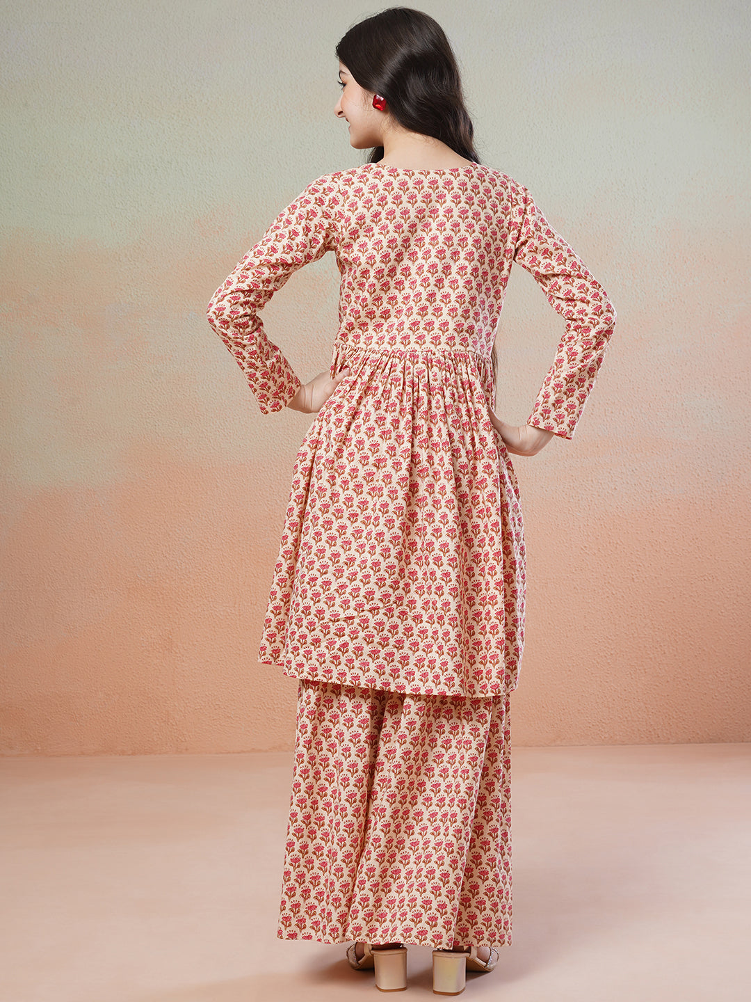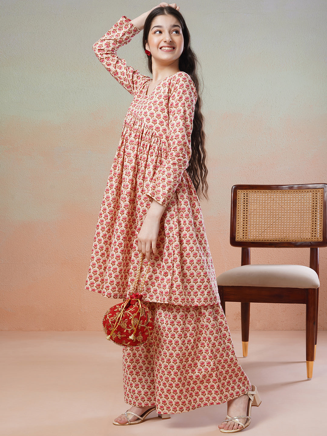 This Peach Girls Ethnic Motifs Printed Empire Kurta with Sharara features a beautiful anarkali shape and an empire style, perfect for any occasion. Made with a cotton blend machine weave fabric, it offers comfort and style. The ethnic motifs printed on both the kurta and the sharara add a touch of elegance and the elasticated waistband allows for a secure and comfortable fit.