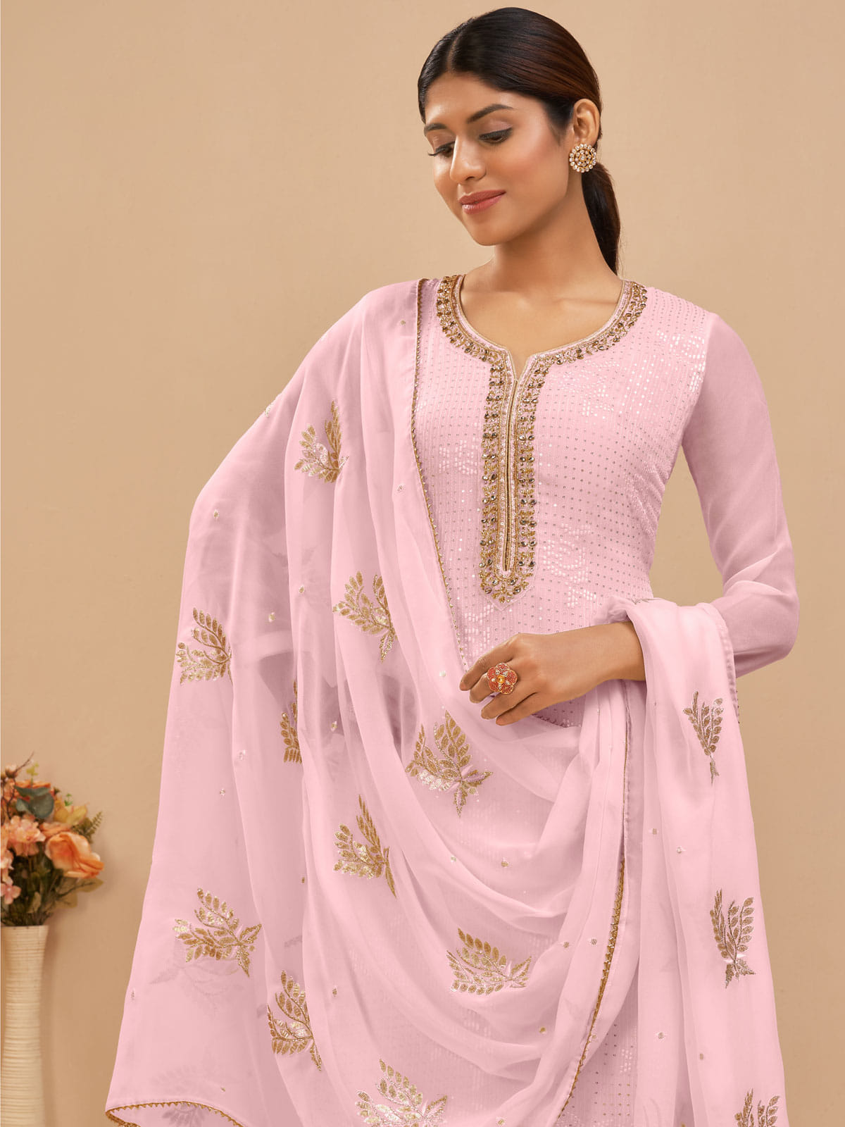 This exquisite Pink Multi Embroidered Pakistani Pant Style Suit is perfect for adding a touch of traditional elegance to your ethnic wear collection. It features intricate khatli work with golden zari, sequence, and bead embroidery, as well as a detailed neckline and lace border. Paired with solid pants and a sequin-embellished dupatta, this suit is the perfect choice for any special occasion. Complete the look with fancy gold jewelry and heels.