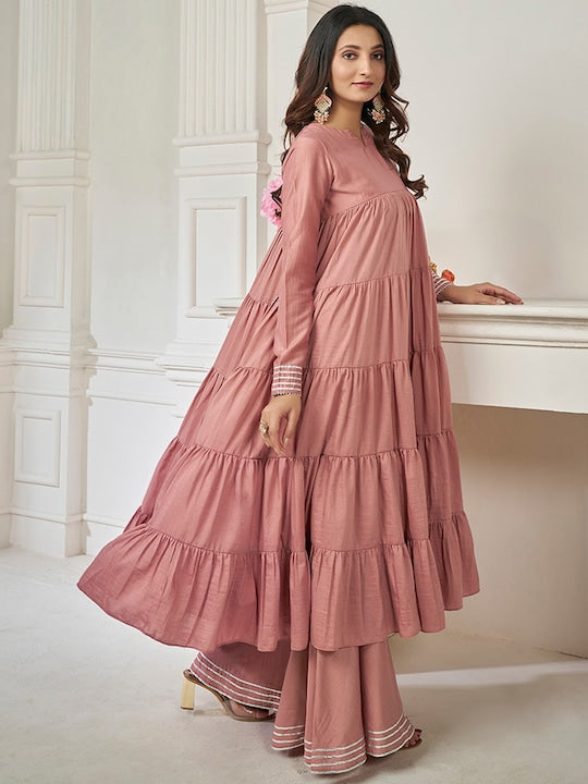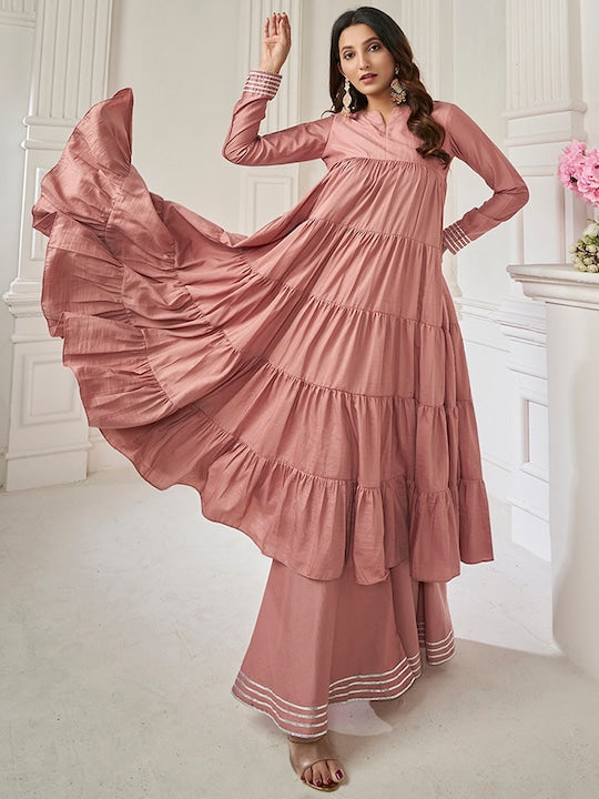 This Peach Striped Round Neck Long Sleeves Gotta Patti Kurta with Sharara features a stylish anarkali shape and tiered design, along with a round neck and long sleeves for a comfortable fit. The kurta also includes convenient pockets and beautiful gotta patti detailing. The matching striped sharara has a partially elasticated waistband for easy wear. Made with a silk blend machine weave fabric, this set is perfect for any occasion.