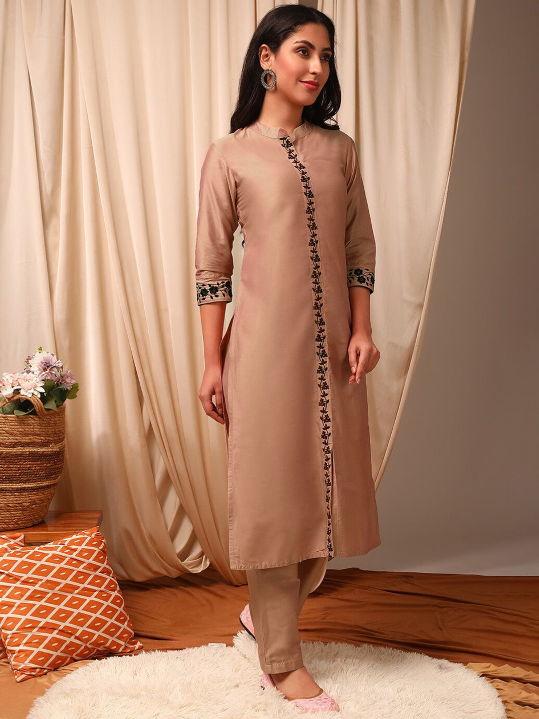 This Peach Kurta and Trousers set features a beautiful floral yoke design and high slit style, giving a modern and elegant touch. Made with a silk blend machine weave fabric, it offers a comfortable fit while the mandarin collar and three-quarter regular sleeves add a sophisticated look. The trousers have a partially elasticated waistband and slip-on closure for convenience.