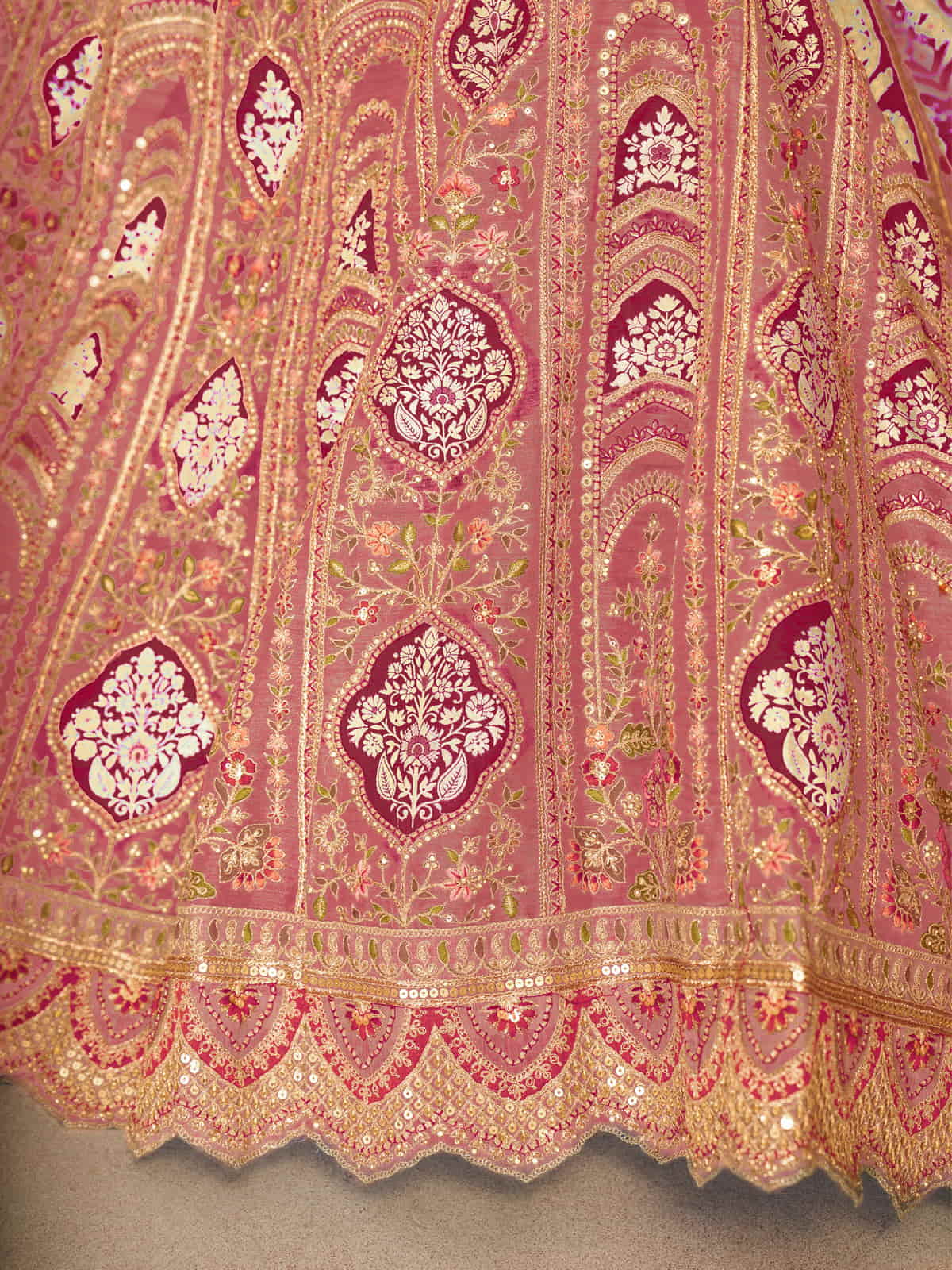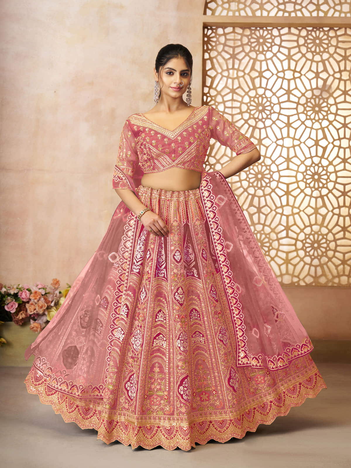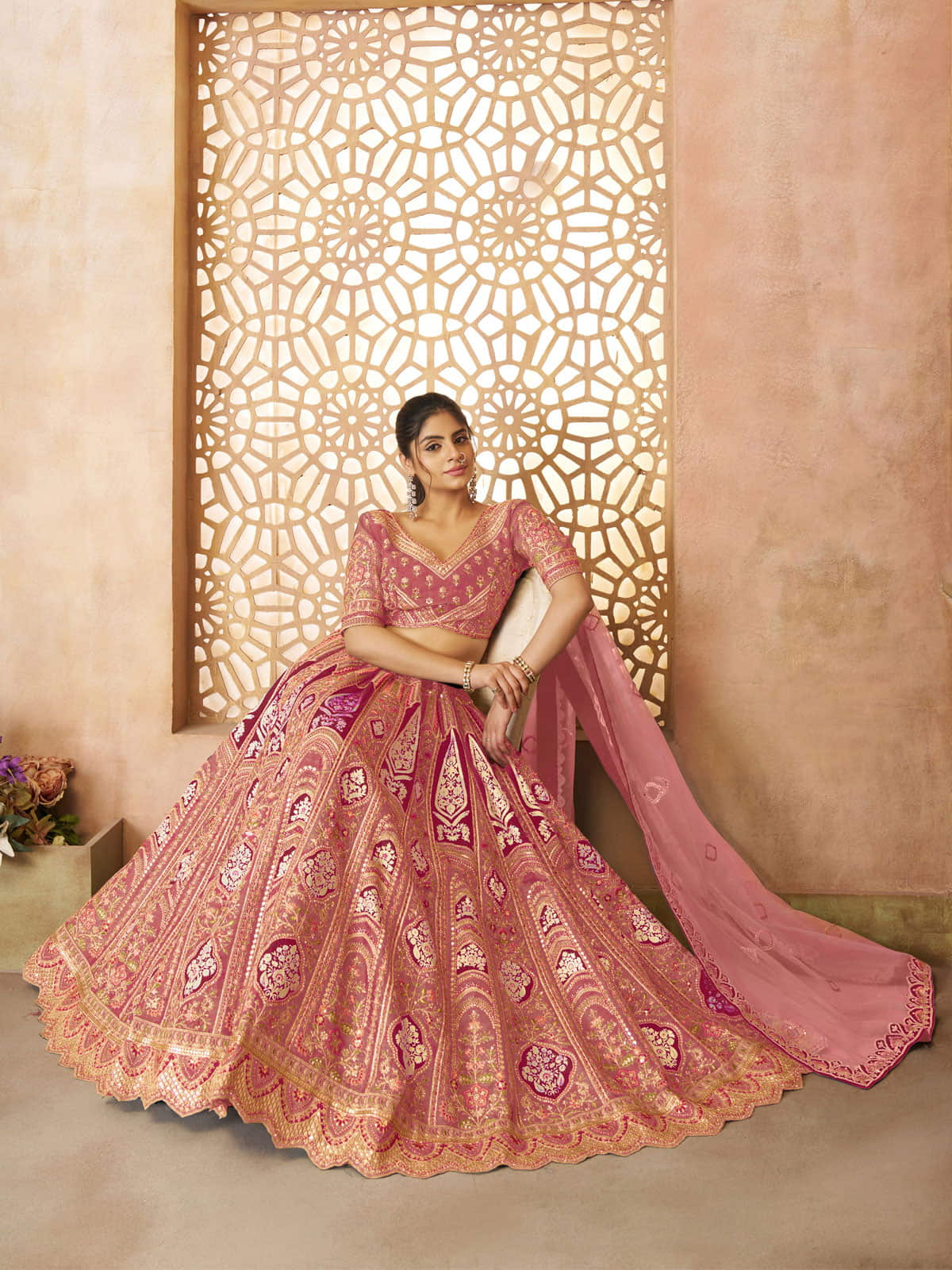 Elevate your bridal ensemble with this exquisite pink wedding lehenga. Masterfully adorned with intricate aari embroidery and delicate floral motifs, it showcases exceptional craftsmanship. The luxurious Banarasi patch introduces a heritage element, creating a harmonious balance between contemporary elegance and traditional artistryƒ??a distinguished choice for the discerning bride.