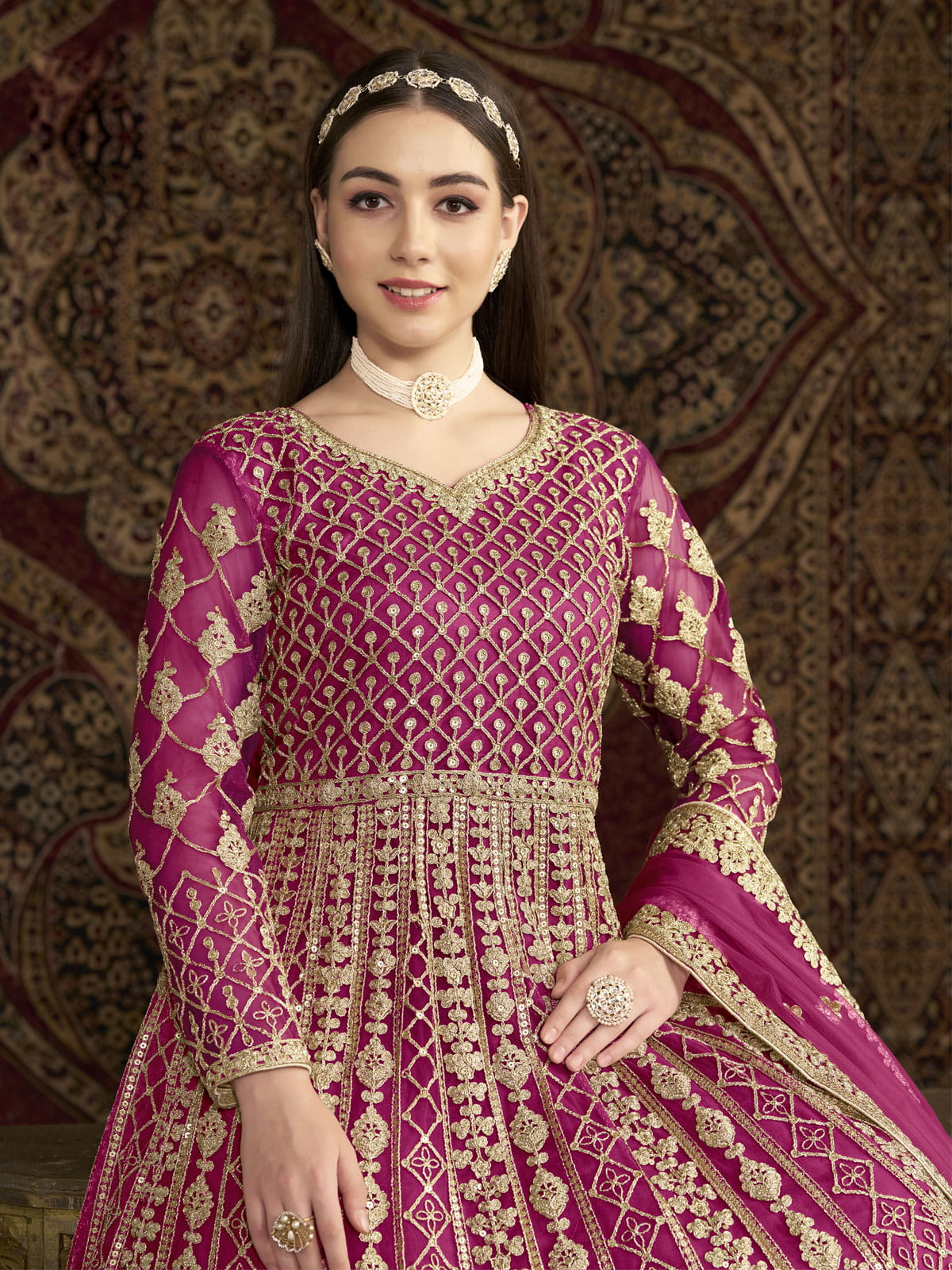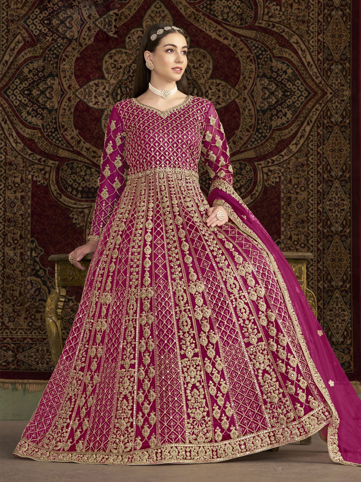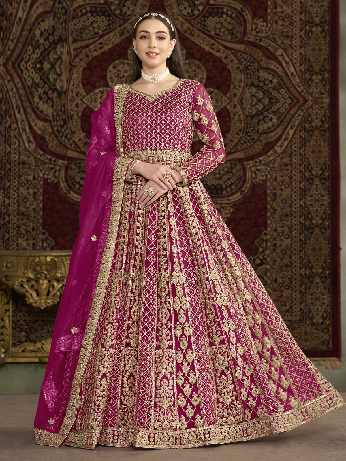 Elevate your wedding or festival look with our Pink All Over Embroidered Net Wedding Anarkali Gown by Empress. Made with high-quality net and adorned with zari threads and sequins, this gown exudes elegance. Add on the matching bottom and embroidered dupatta for a complete traditional ensemble.