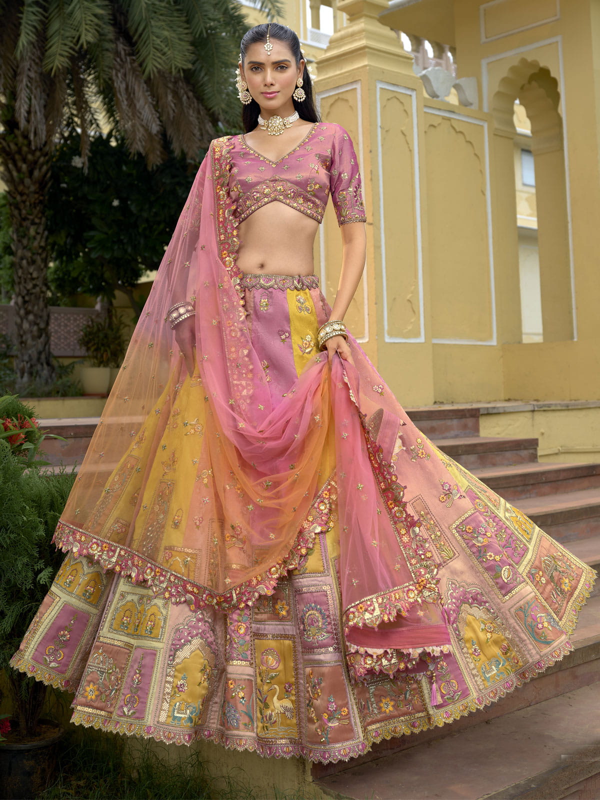 Pink And Peach Traditional Embroidery Bridal Lehenga Choli Elevate your bridal ensemble with this stunning lehenga choli, meticulously crafted from premium silk fabric. The lehenga showcases intricate resham thread embroidery, sequins, beads, and golden zari detailing that create a luxurious, traditional aesthetic. The designer choli features complementary embellishments, while the richly embroidered net dupatta adds graceful layers and sophistication. Ideal for weddings and bridal celebrations, this three-piece set delivers timeless elegance. Blouse available up to size 40-42; contact us for plus-size customization. Complimentary international shipping included. Style with statement jewelry and heels for a radiant, unforgettable bridal look.