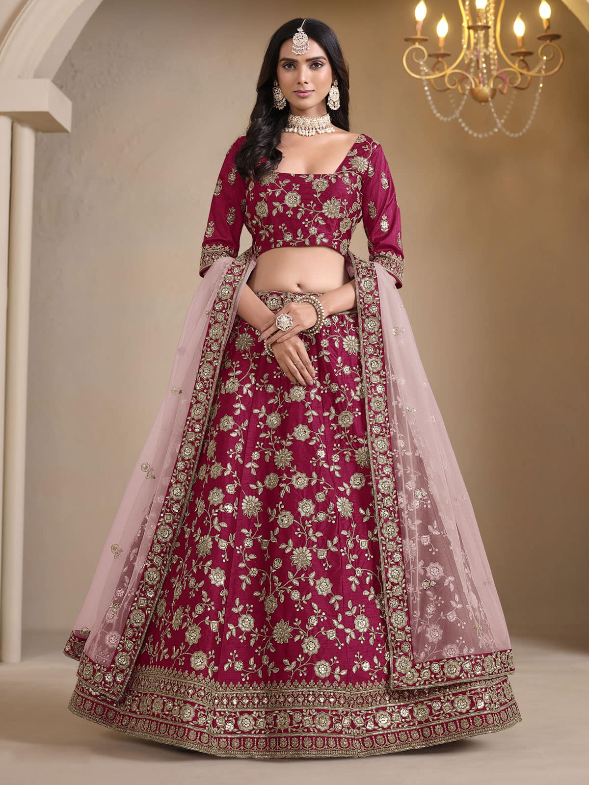 Capture the spotlight with this Pink Bridesmaids Style Art Silk Wedding Lehenga Choli by Inddus. Crafted from premium art silk, it offers a luxurious drape and graceful movement. Intricate thread and sequin embroidery adorn the vibrant fabric, creating a captivating pattern. The ensemble includes a matching embroidered blouse and a delicate net dupatta, perfect for bridesmaids and wedding festivities. Pair it with traditional jewelry to elevate your look into a timeless celebration of elegance and style.