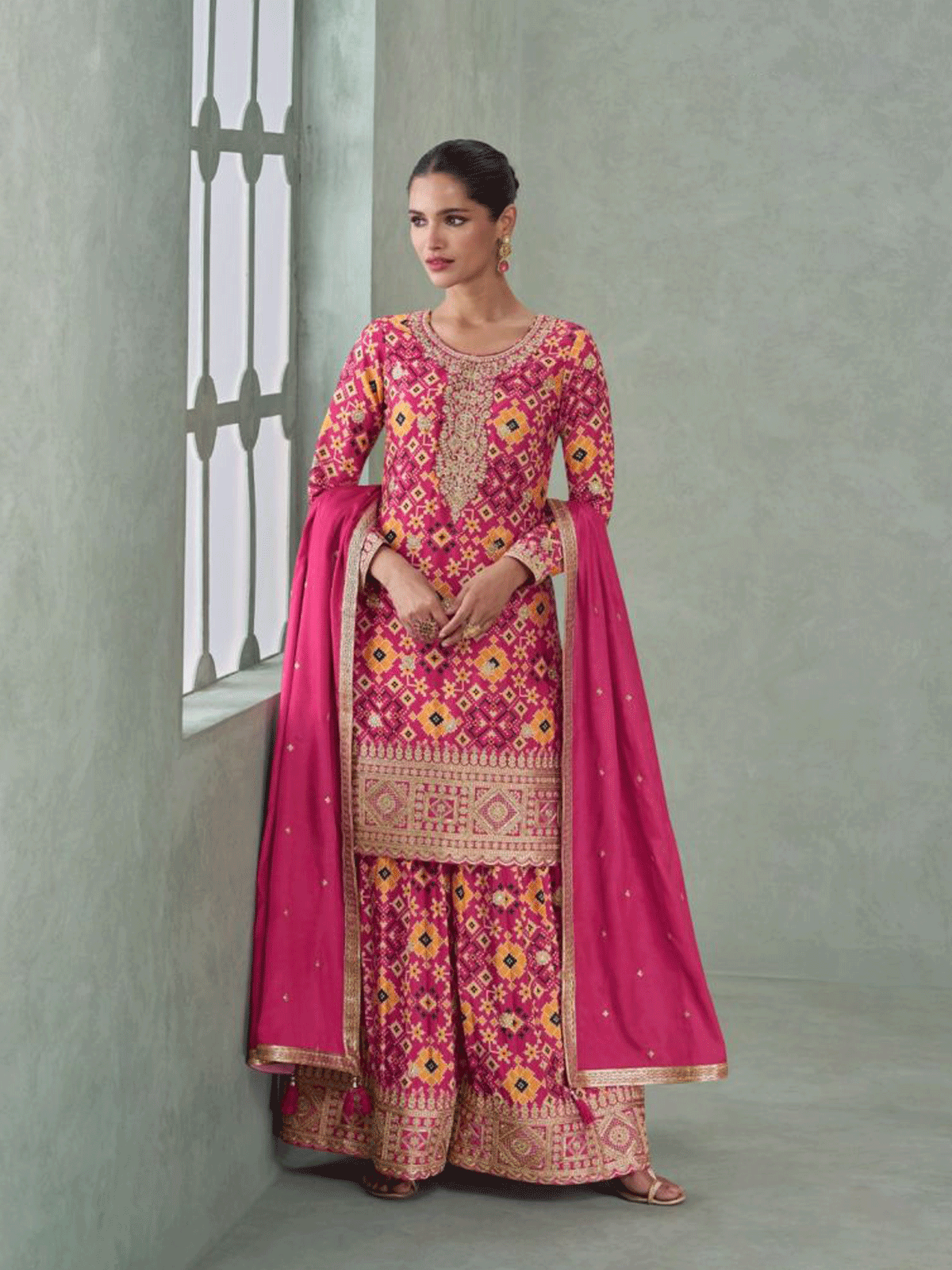 The palazzo pants are tailored in chinon silk with a fully elastic waistband for comfortable, flowing wear. Adorned with matching zari embroidery, sequins, and ikat prints, they complement the kameez perfectly. A coordinating pink chinon silk dupatta with zari and sequin work completes the sophisticated set.