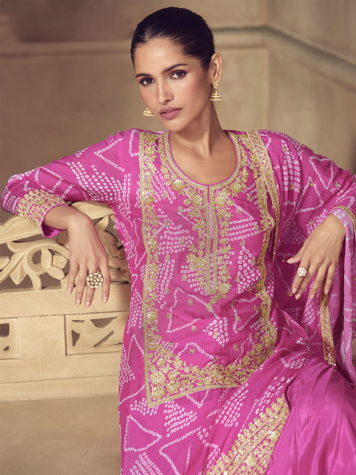 Celebrate timeless tradition with the Pink Embroidered Festive Gharara Style Suit from Inddus. Crafted from premium real chinnon fabric, this suit offers luxurious comfort and elegant flow. Intricate zari thread embroidery, complemented by digital prints and delicate sequin work, enhances its sophisticated charm, making it an ideal choice for festive occasions and celebrations.