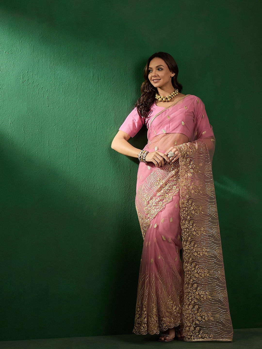 This stunning pink saree features intricate ethnic motifs and a delicate zari border, all hand-embroidered with precision. The sequined details add a touch of glamour to this traditional garment. Comes with an unstitched blouse piece for customization. The blouse worn by the model is for display only. See the image for the actual blouse design. Transform your look with this exquisite saree.