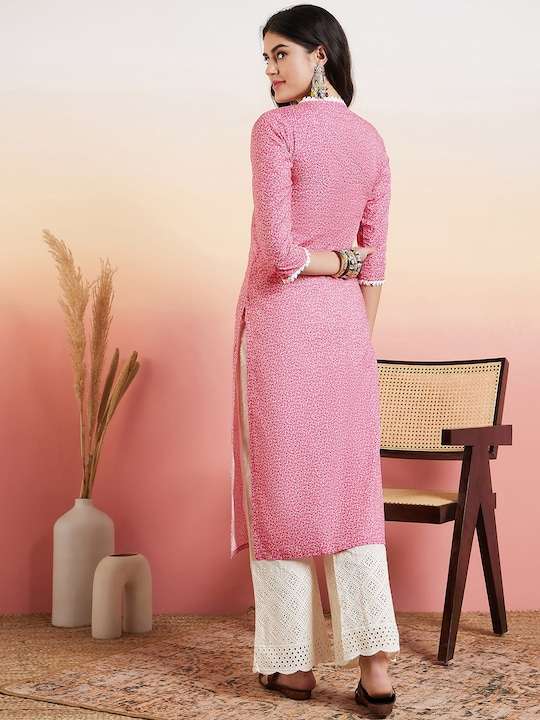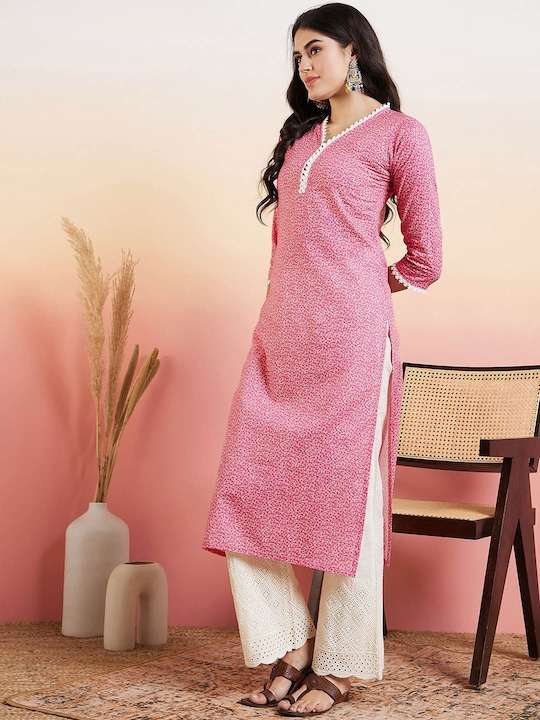 This pink printed kurta with palazzos is a must-have for any fashion-forward individual. Made from pure cotton, the kurta features ethnic motifs and chikankari details, while the palazzos boast beautiful embroidery. The kurta has a regular style with a v-neck and three-quarter sleeves, and the palazzos have a partially elasticated waistband for comfort.