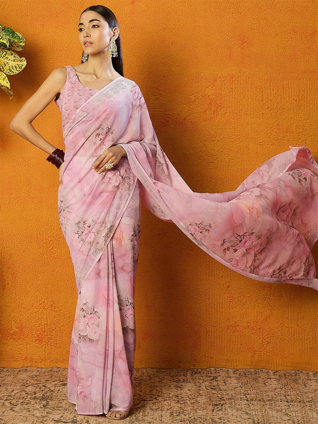 This elegant pink and grey saree features a beautiful floral print and a delicately embroidered border. The saree is adorned with intricate beads and stones, adding a touch of glamour to its feminine charm. Crafted from Poly Georgette, this saree is lightweight and comes with an unstitched blouse piece.
