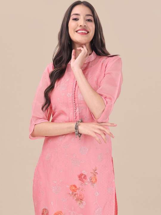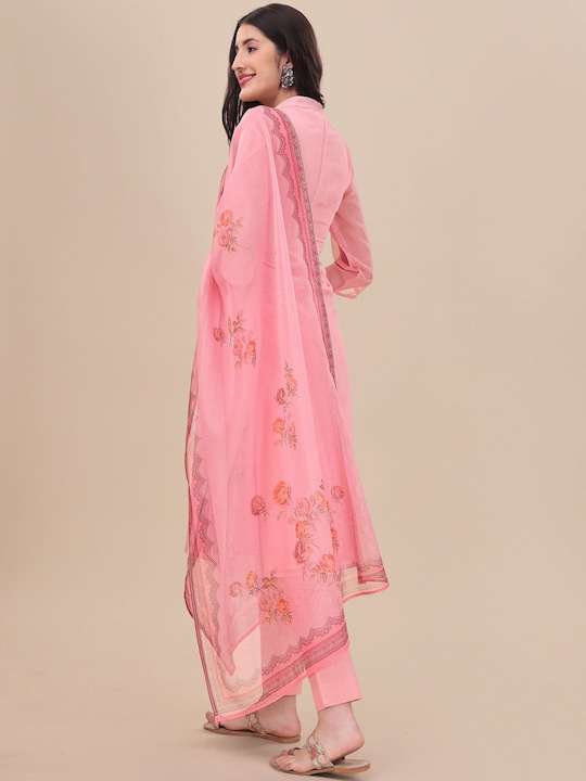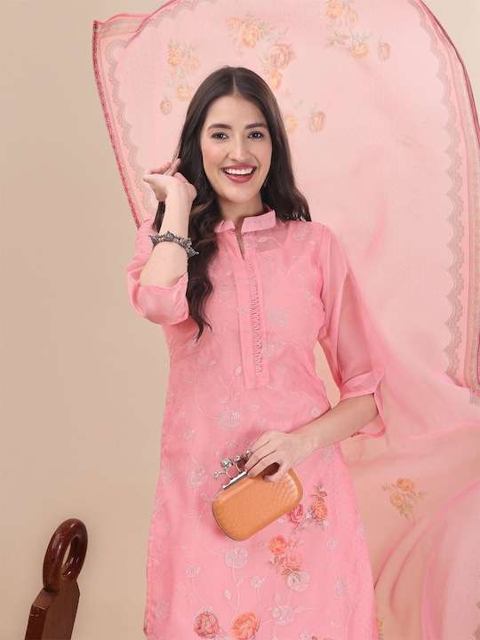 Pink Floral Embroidered Straight Kurta & Trousers With Dupatta