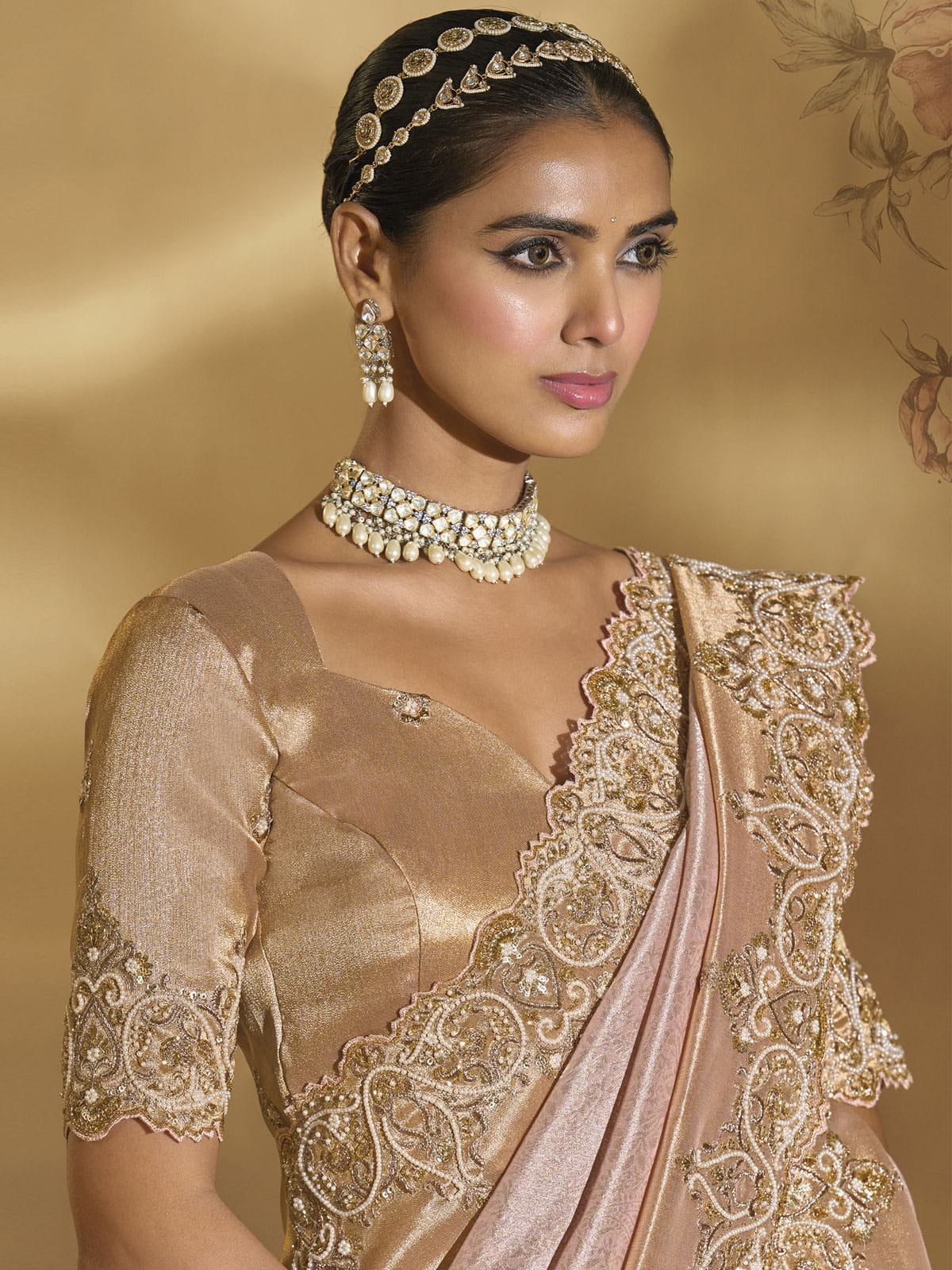 This Pink Golden Handwork Embroidery Saree represents the pinnacle of traditional Indian textile artistry. Crafted on sumptuous silk, it features meticulously executed zari embroidery complemented by resham threads, beads, mirrors, and sequins that create dimensional depth across the pallu and daman. The accompanying raw silk blouse showcases equally elaborate embroidery work, elevating the ensemble's sophistication. Each element—from the lustrous golden accents to the intricate detailing—demonstrates exceptional craftsmanship suited for weddings and significant celebrations. Pair with kundan jewelry and heels to complete a refined, show-stopping look. Part of our Wedding 2025 collection with complimentary international shipping.