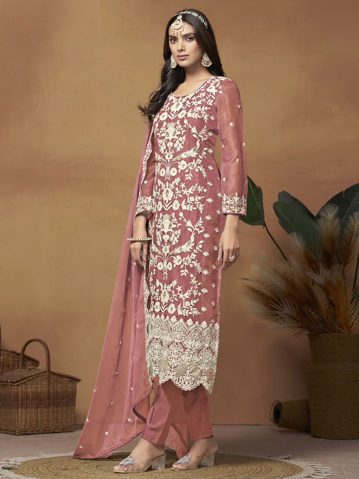 Elevate your traditional look with our Pink Organza Embroidered Designer Salwar Suit. Made with high-quality organza, this suit is adorned with intricate thread and sequins embroidery, adding an elegant touch to any occasion. Complete your look with matching bottom and organza dupatta, and accessorize with traditional jewelry for a show-stopping look. Perfect for weddings, formal events, or family gatherings.