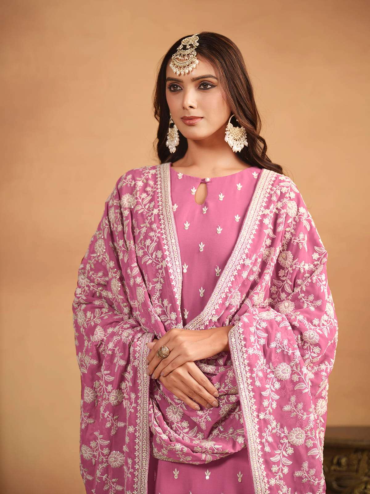 This Pink Thread And Sequence Embroidery Pant Style Salwar Suit is perfect for ethnic lovers looking for a traditional yet stylish outfit. Its straight cut georgette top, solid santoon silk pants, and georgette dupatta are adorned with resham thread dori and sequence work for an elegant touch. Make a statement this Eid with this complete and perfectly crafted set.