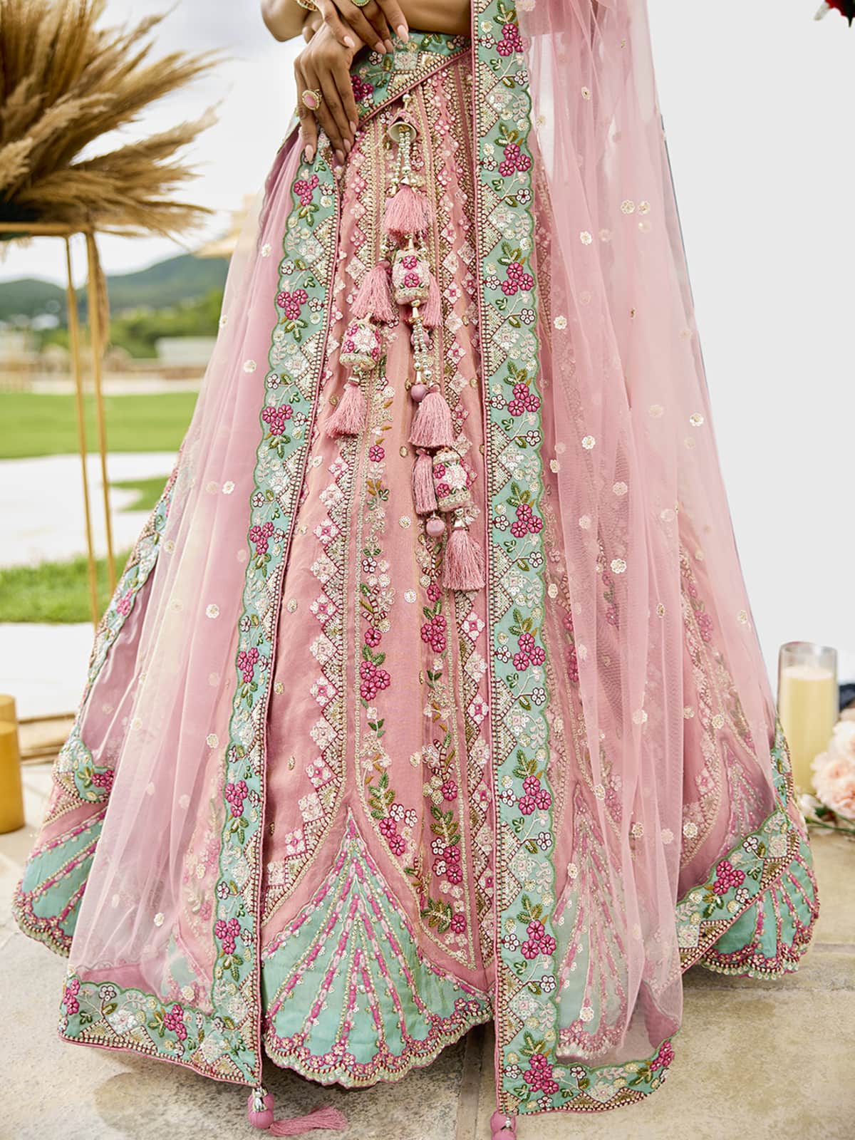 Lehenga:- Made of premium quality pink Color with Tissue fabric Full Flaire Semi-Stitched Lehenga With Sequins and stone and Coding work has a thread Embroidery work. Has a thread cutwork border on the hemline.