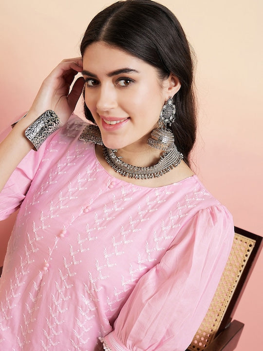 This Pink & White Floral Kurta and Trouser set offers a delicate and stylish design with its floral embroidery and pure cotton fabric. The straight shape, round neck, and puffed sleeves add a touch of elegance while the partially elasticated waistband ensures a comfortable fit. Perfect for everyday wear or special occasions.