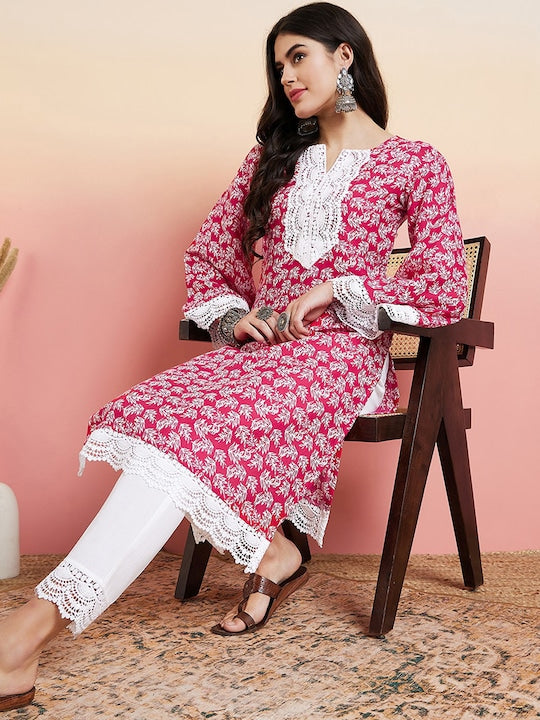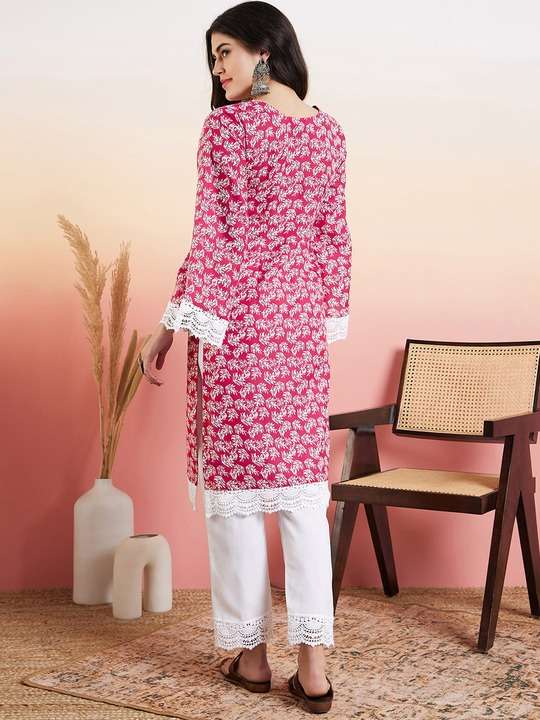 Upgrade your wardrobe with our Pink & White Floral Printed Thread Work Straight Kurta. Made with machine-woven regular cotton, this kurta features a notched neck and long, flared sleeves for a comfortable fit. The intricate thread work adds a touch of elegance to its floral print. Perfect for any occasion, this calf-length kurta will elevate your style effortlessly.