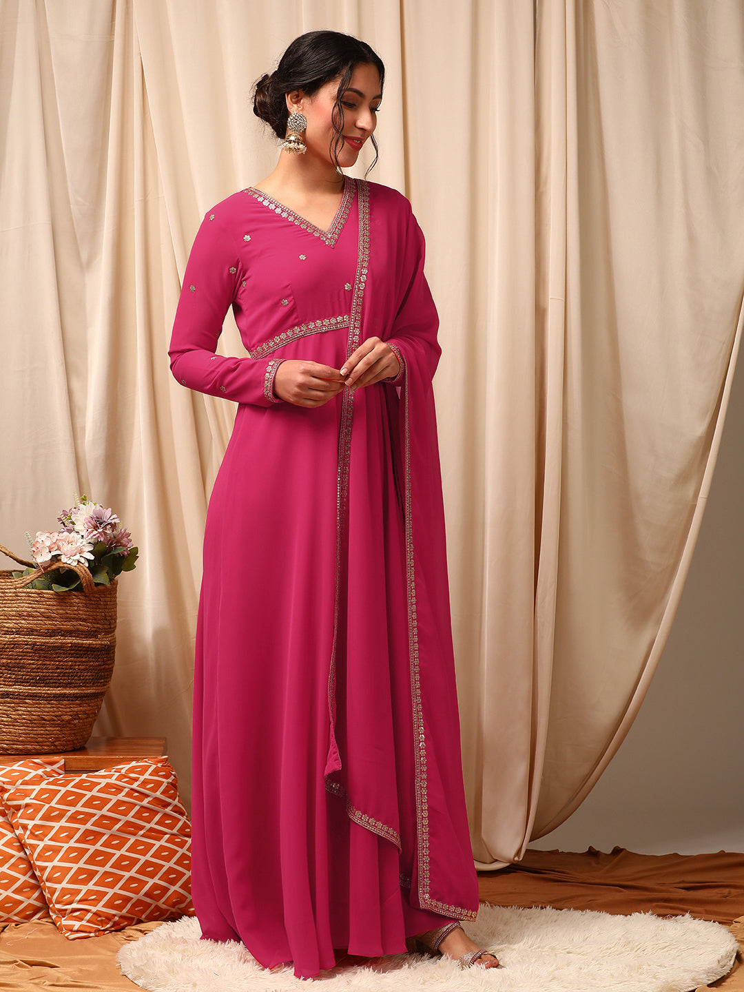 This Pink Women Flared Sleeves Sequinned Georgette Anarkali Kurta is a stunning addition to any wardrobe. The pink color and solid design make it versatile for any occasion. The V-neck and long, flared sleeves add a touch of elegance, while the Anarkali shape and empire style provide a flattering fit. The sequinned detail adds a touch of sparkle, and the ankle length with flared hem is perfect for any height. Made with machine weave regular georgette, it is both comfortable and stylish.