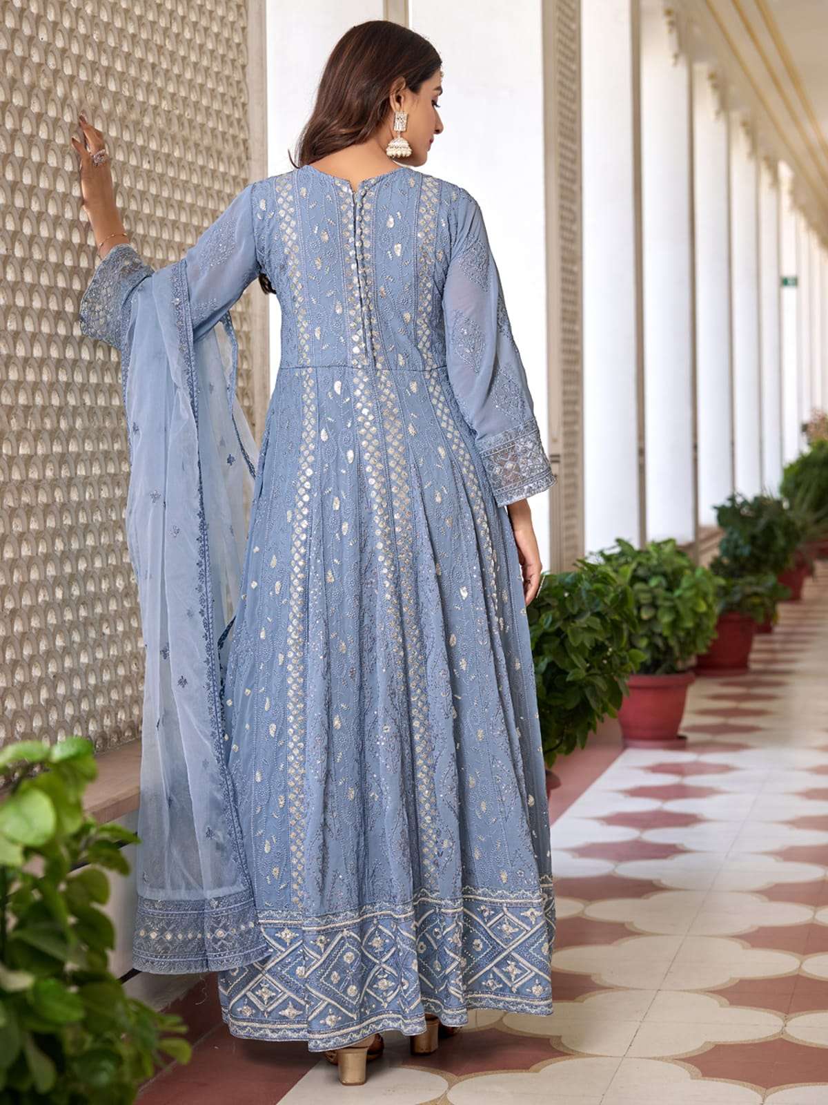 Buy pleasing sky blue georgette high slit style suit with cudidar pant online for navratri and diwali celebration from Inddus. This elegant set comprises a georgette hight slit style suit with matching georgette dupatta and georgette bottom.