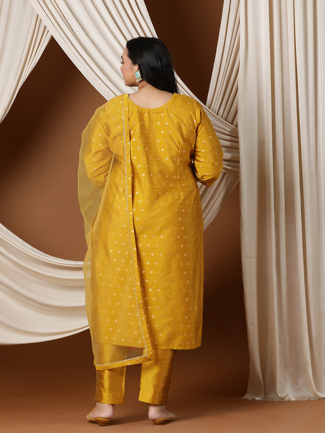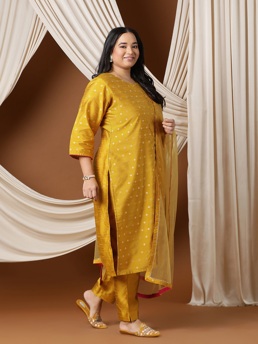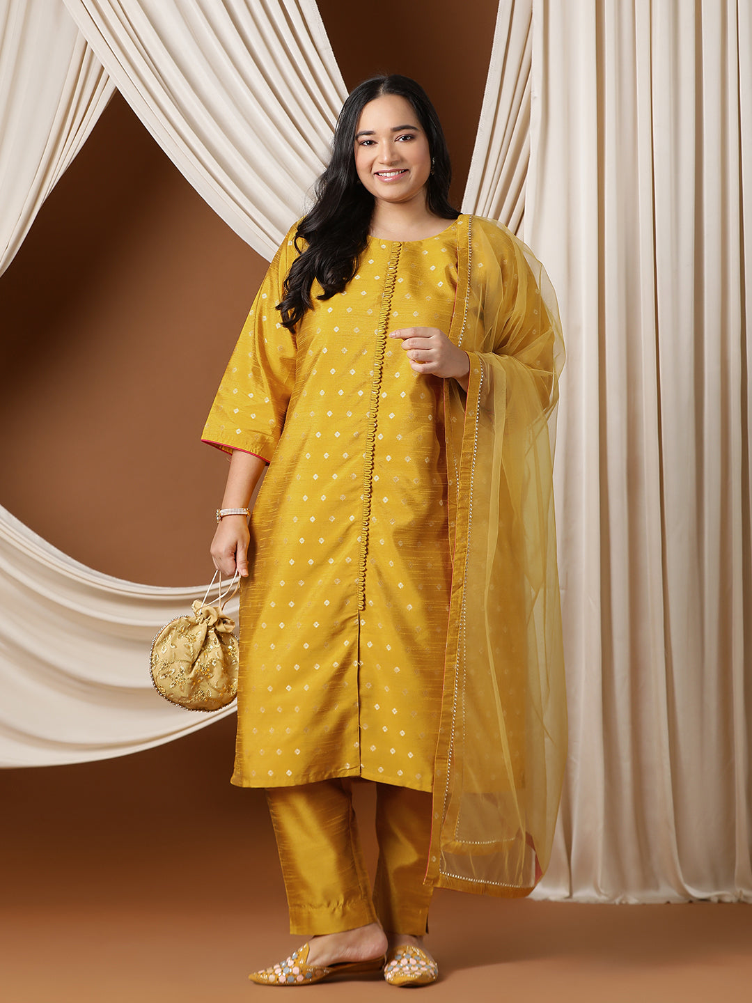 This Plus Size Woven Design Straight Kurta With Trousers & Dupatta features a mustard yellow and gold toned woven design Kurta with a straight shape and round neck. The trousers offer a partially elastic waistband for comfortable wear while the solid dupatta adds a touch of elegance. Made of silk blend machine weave fabric for durability and style.