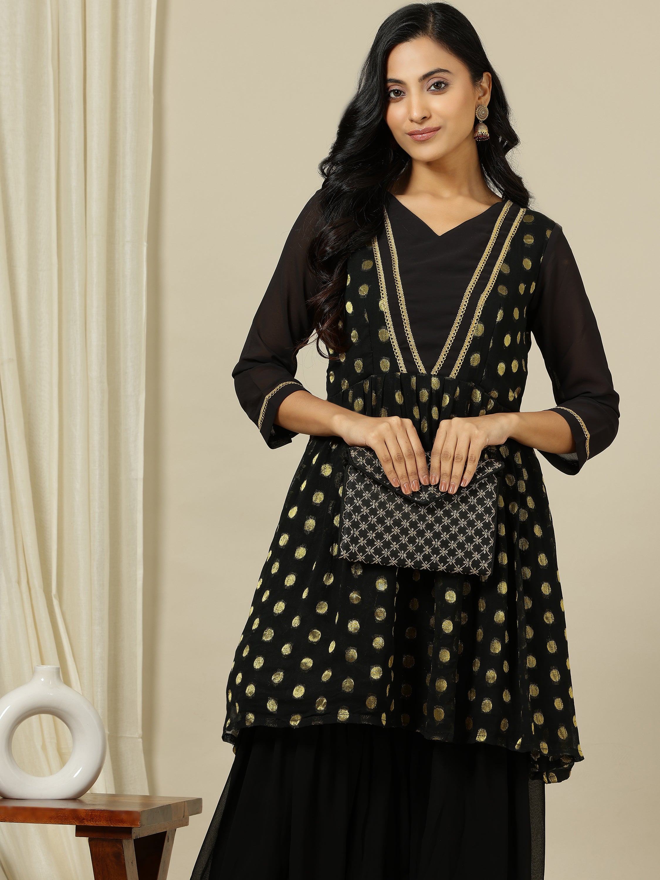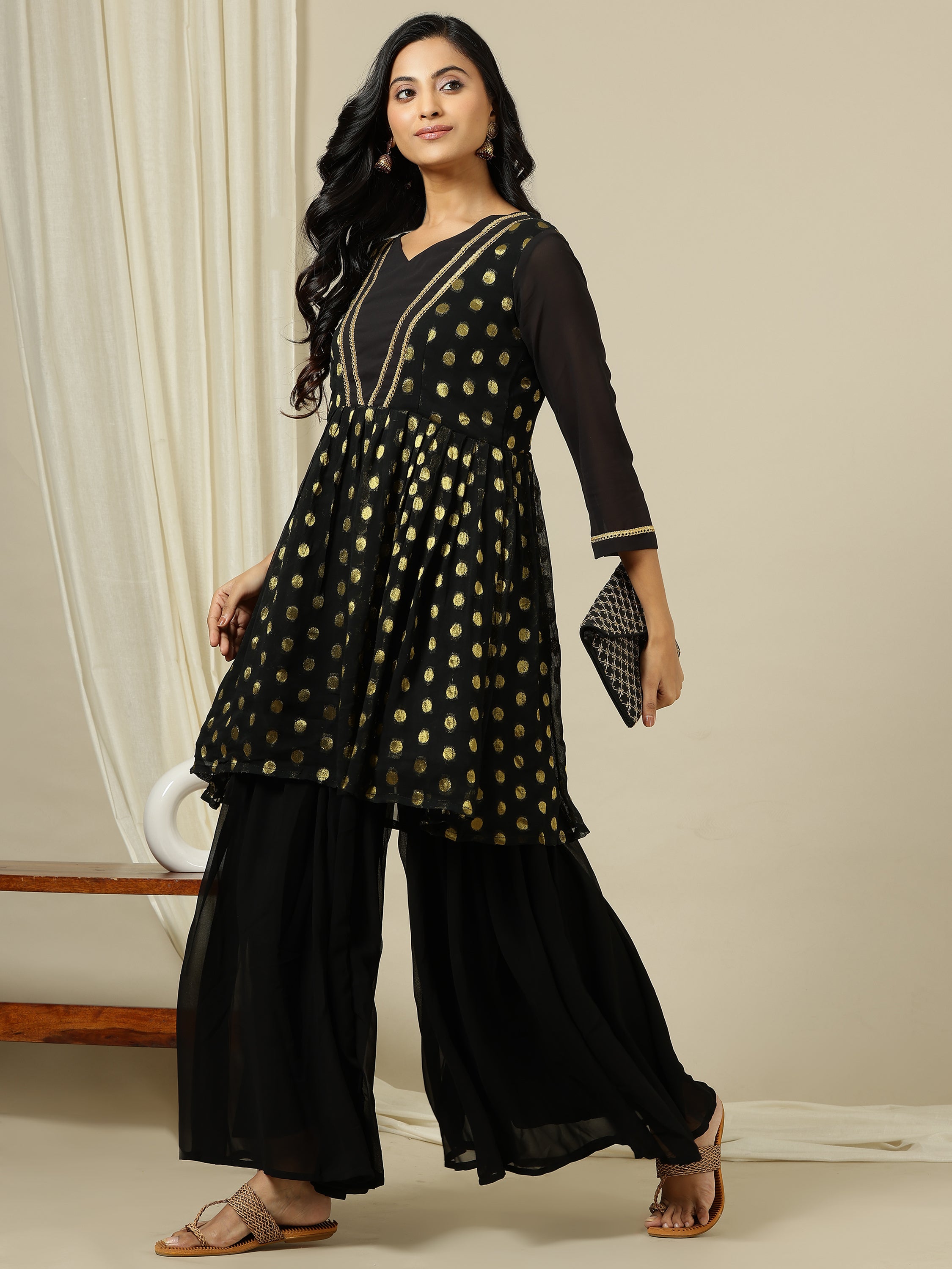 This sophisticated kurta and sharara set features a polka dot embroidery design, creating a timeless and elegant look. The pleated A-line kurta, with its V-neck and three-quarter sleeves, is made of georgette fabric with zari detailing for added luxury. The solid colored sharara, with a partially elasticated waistband and slip-on closure, offers both comfort and style. Perfect for any special occasion.