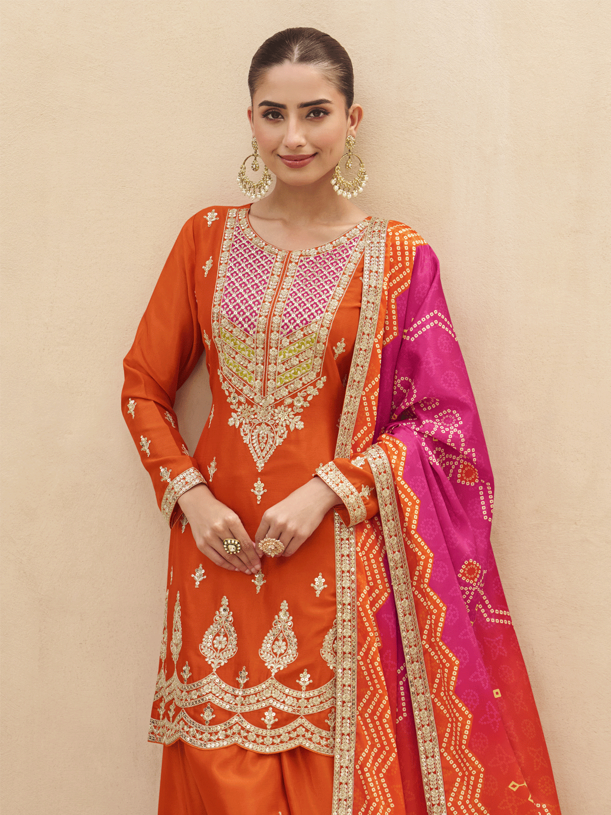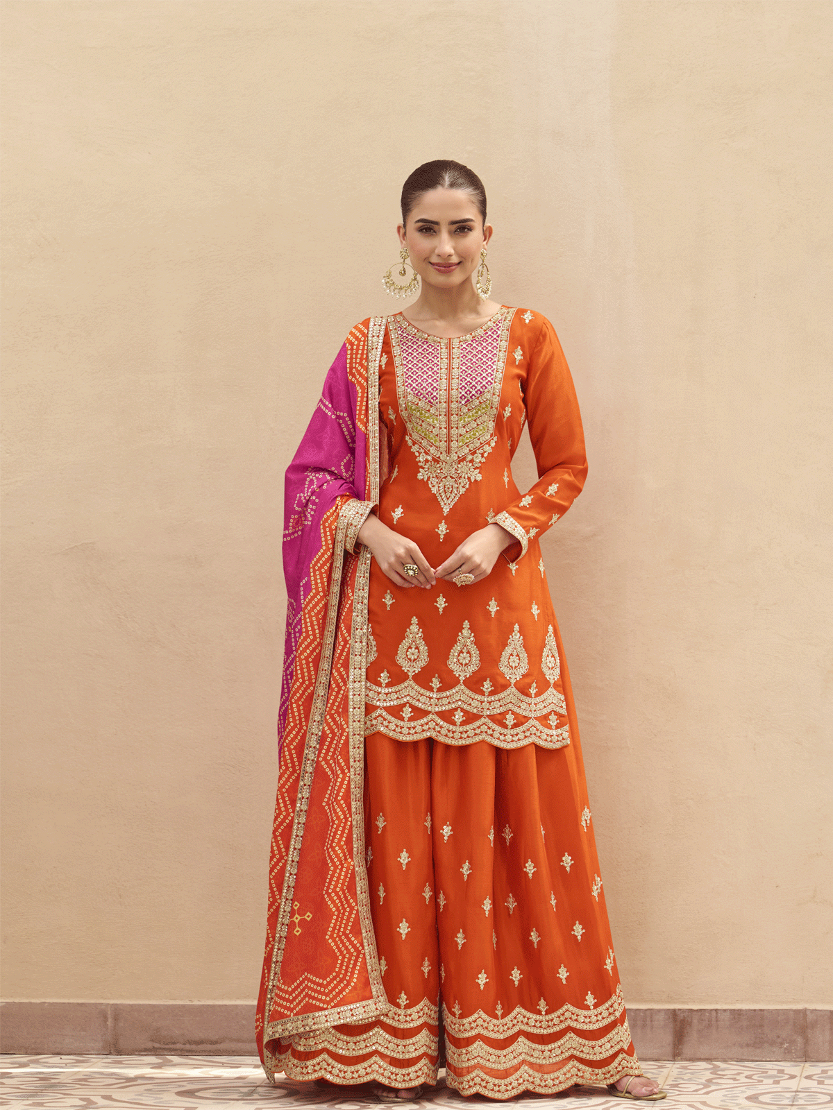 Elevate your festive wardrobe with this Beige Premium Tora Silk Embroidered Palazzo Suit from Inddus. Crafted from luxurious real Tora silk, this ensemble combines timeless sophistication with contemporary elegance. The garment showcases meticulously executed aari thread embroidery complemented by shimmering sequin detailing, creating a striking visual impact. The palazzo silhouette offers graceful movement and comfort, making it an ideal choice for weddings, celebrations, and special occasions. The rich traditional craftsmanship ensures a refined appearance that resonates with both classic and modern sensibilities, delivering a statement piece worthy of your most memorable events.