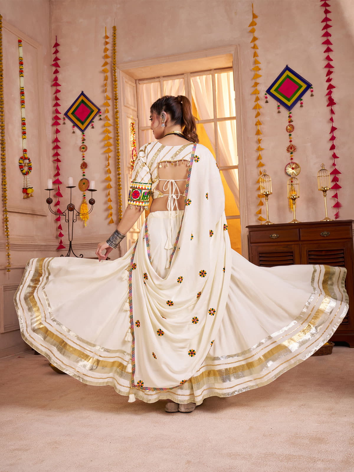 Celebrate Navratri in style with this premium white cotton Chaniya Choli, expertly crafted from breathable viscose cotton for lasting comfort during festive dance nights. The lehengaƒ??s generous 8.5-meter flair, accented with a luxurious lampi border, adds a rich texture and fluid movement for graceful twirls. Designed with a 42-inch waist and 40-inch length, it ensures a flattering fit ideal for energetic performances. The matching blouse features intricate Kutchi embroidery, mirror work, and Kodi embellishments that honor traditional craftsmanship while enhancing your festival look with authentic detail.