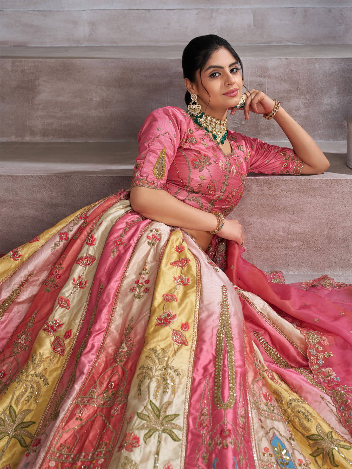 This exquisite pink silk lehenga showcases intricate paisley motifs embroidered with fine thread work, highlighting traditional craftsmanship. The rich silk fabric ensures a luxurious texture and elegant drape, making it an ideal choice for weddings and festive celebrations. Its detailed embroidery adds sophistication, perfectly blending classic design with contemporary appeal.
