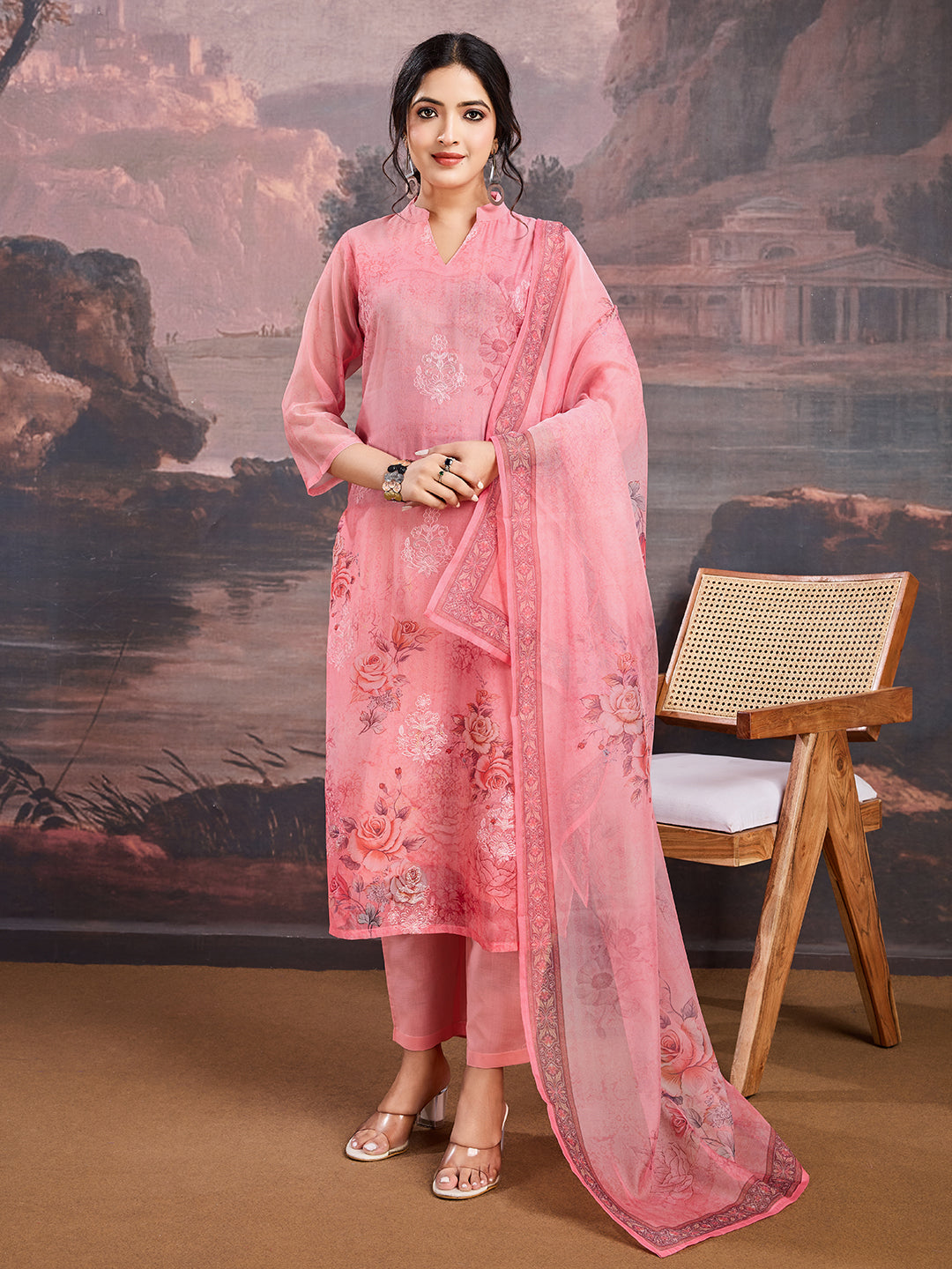 Introducing our Printed Mandarin Collar Organza Straight Kurta with Trouser and Dupatta! Embrace the floral print and straight shape, with regular sleeves and a calf-length hem. Made with organza fabric and accompanied by a solid trouser and printed dupatta, it's perfect for any occasion. Stay stylish and comfortable all day long.
