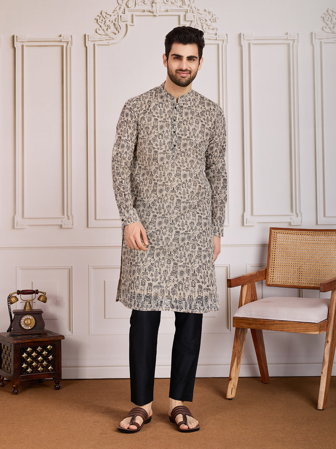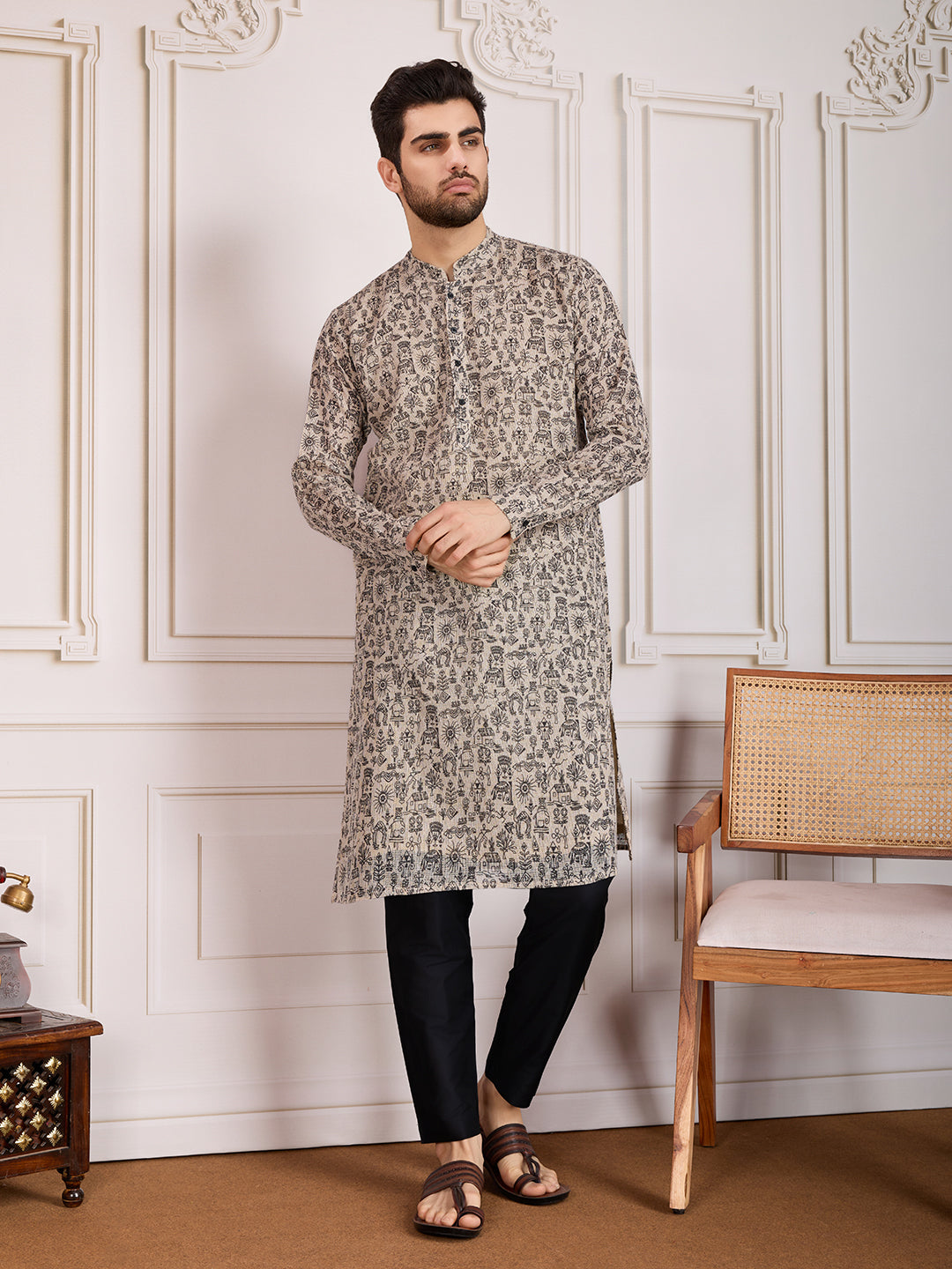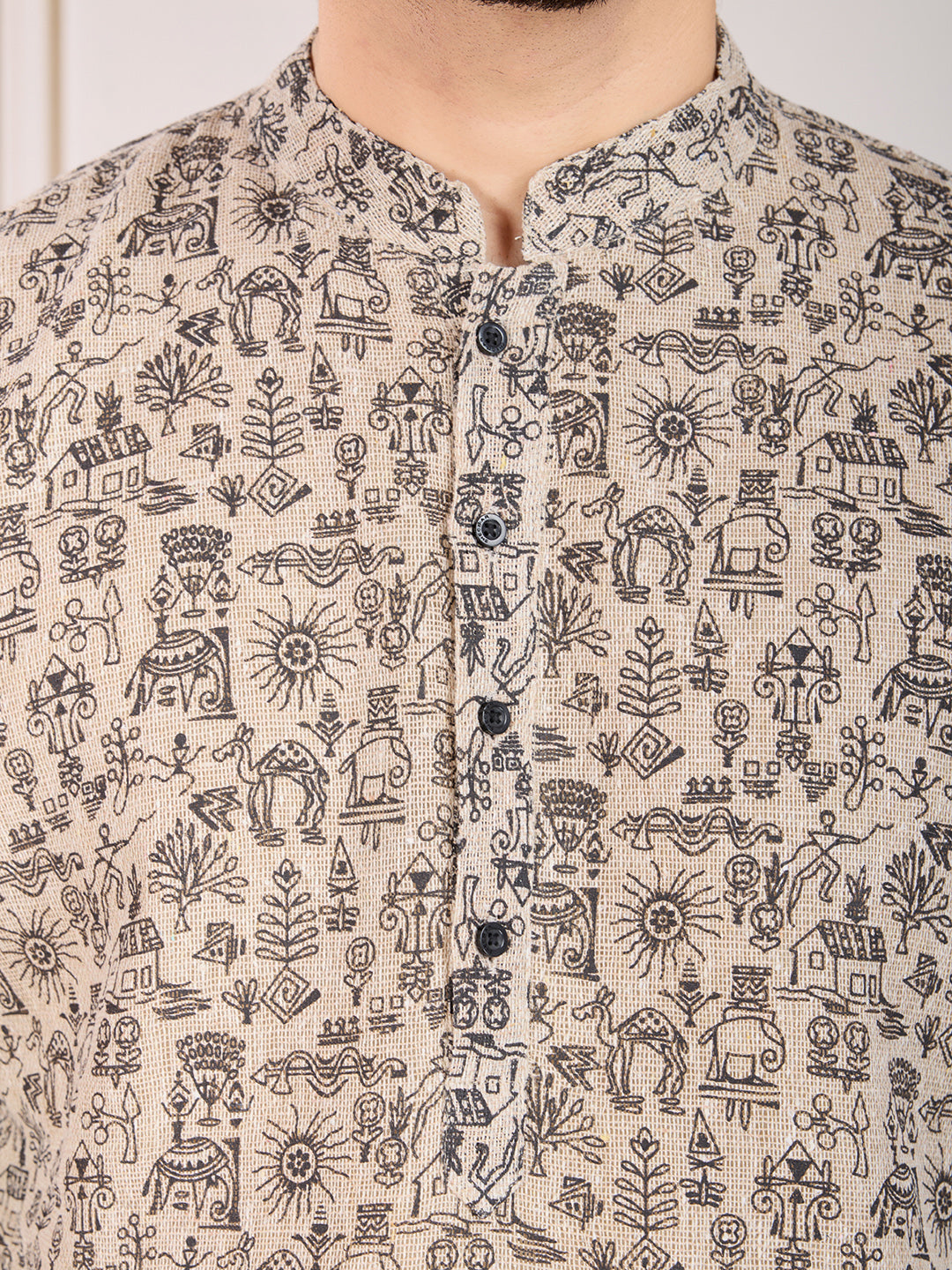 Upgrade your ethnic wardrobe with our Printed Mandarin Collar Straight Kurta Set. Made with machine weave regular cotton blend, this set features a beige printed kurta with a sophisticated Mandarin collar neck and long regular sleeves. Paired with a black solid trouser, this knee-length set is perfect for any formal occasion.