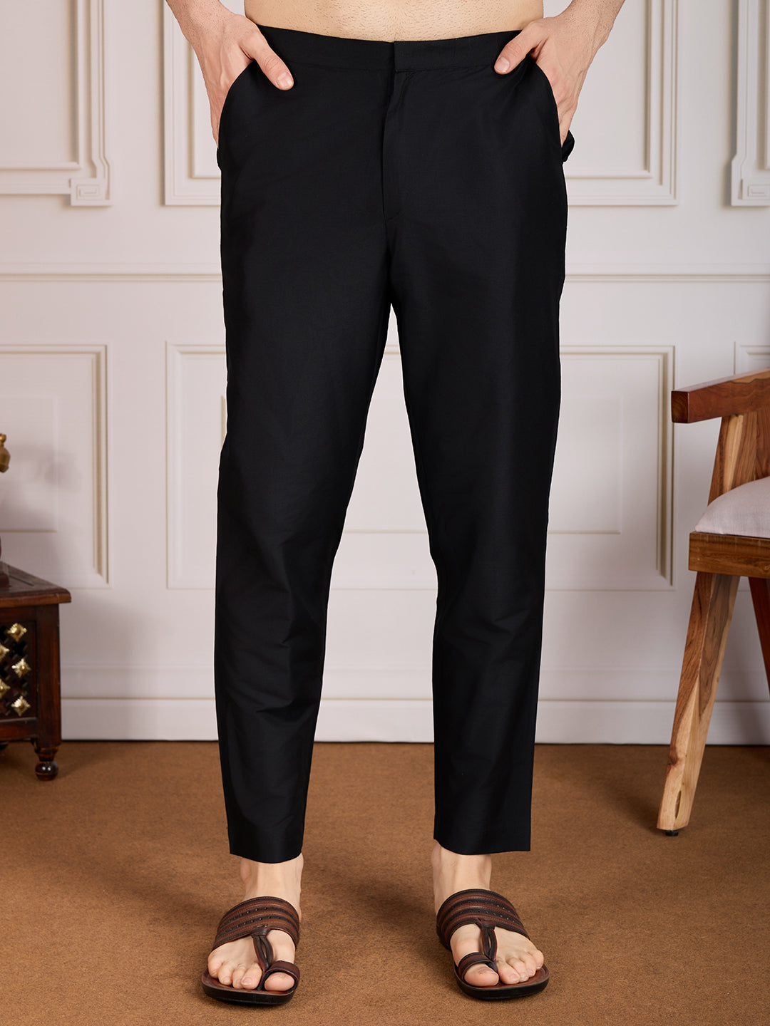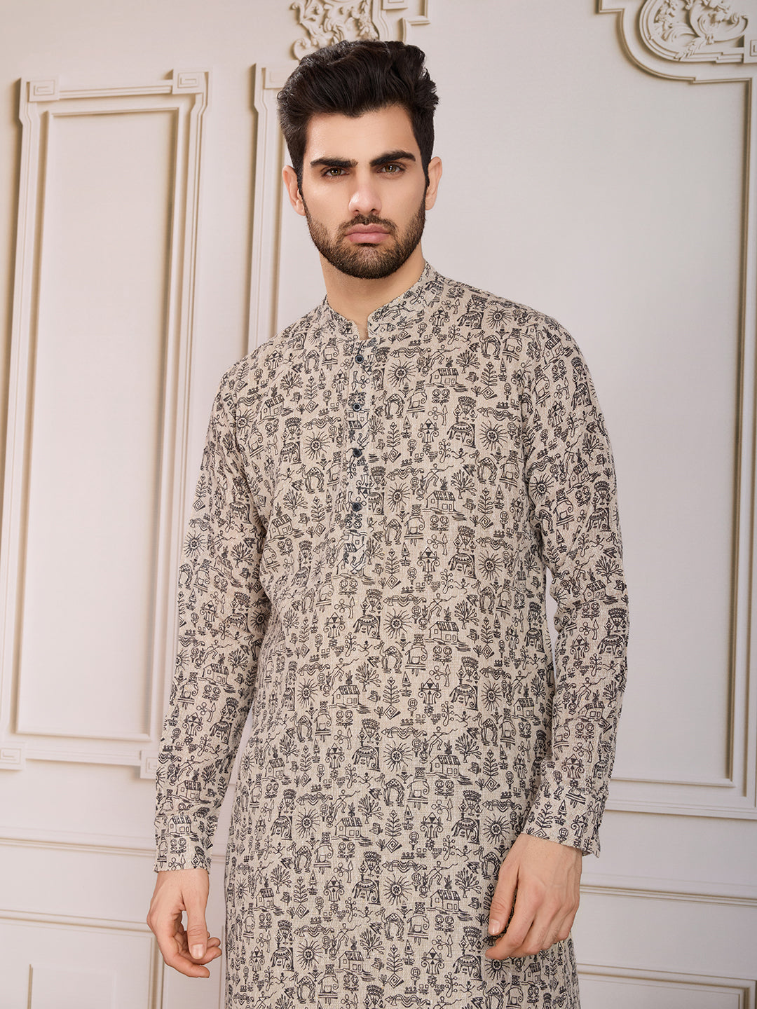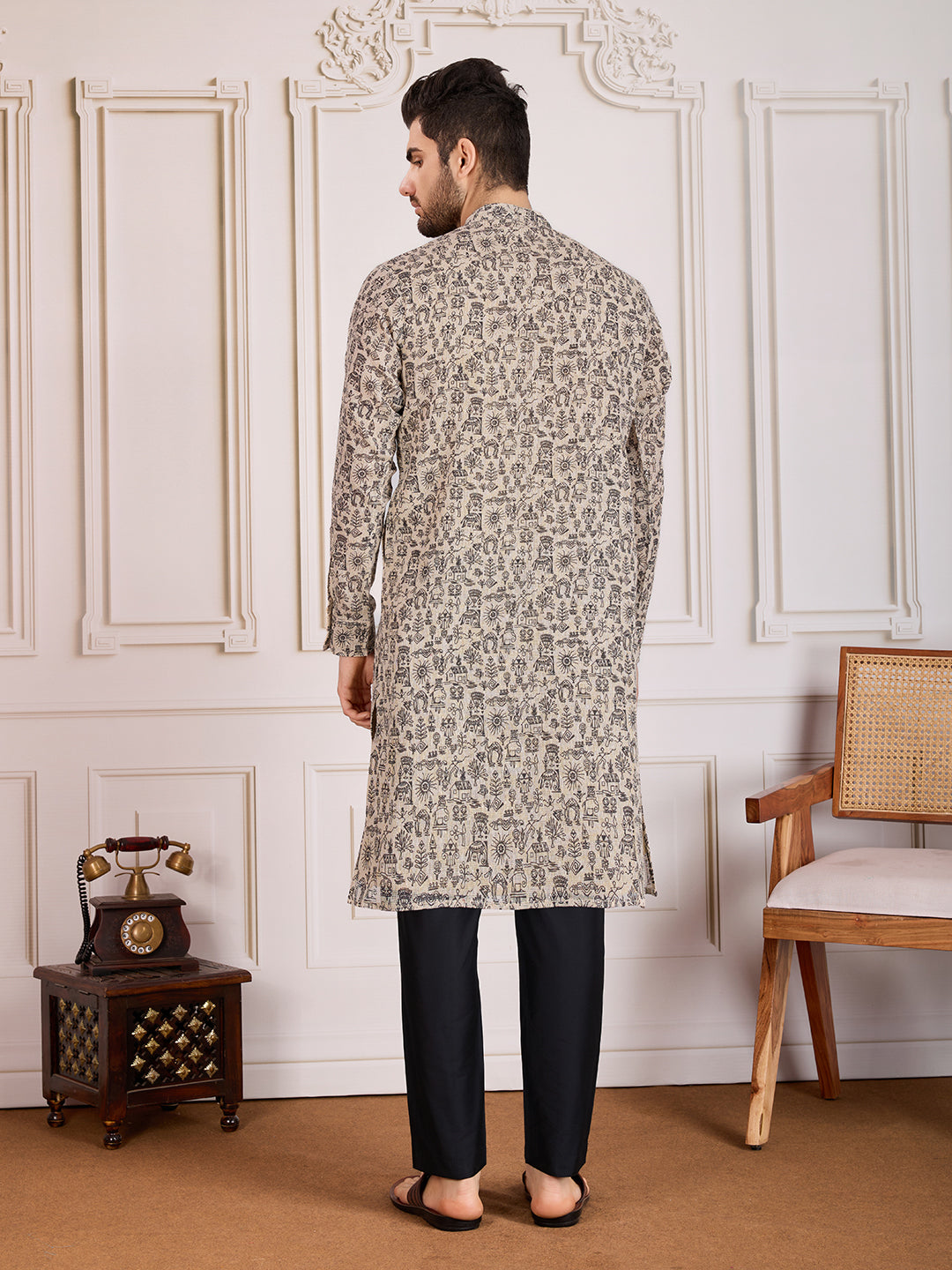 Upgrade your ethnic wardrobe with our Printed Mandarin Collar Straight Kurta Set. Made with machine weave regular cotton blend, this set features a beige printed kurta with a sophisticated Mandarin collar neck and long regular sleeves. Paired with a black solid trouser, this knee-length set is perfect for any formal occasion.