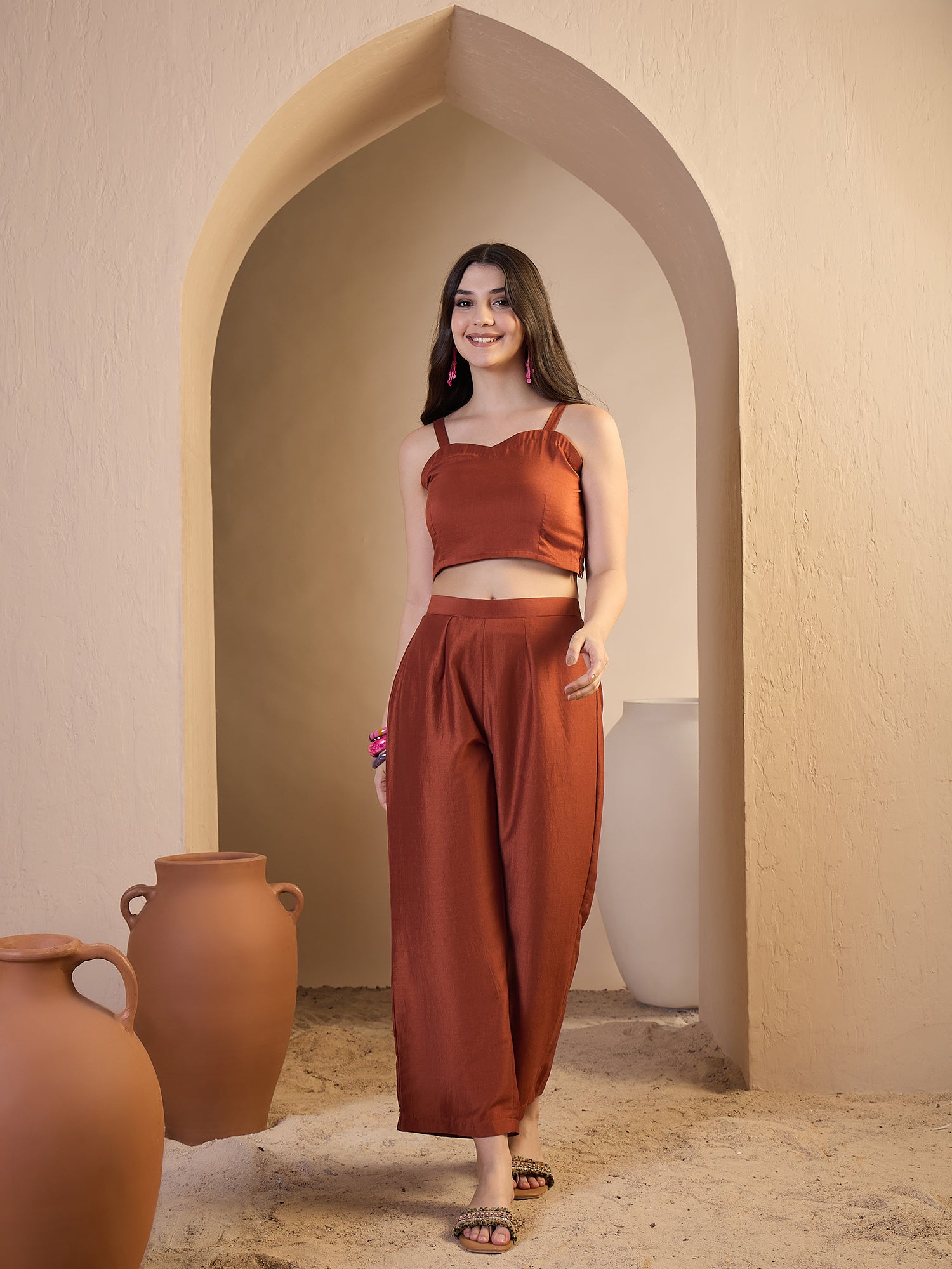 Rust-coloured solid trousers, has an elasticated waistband with slip-on closure