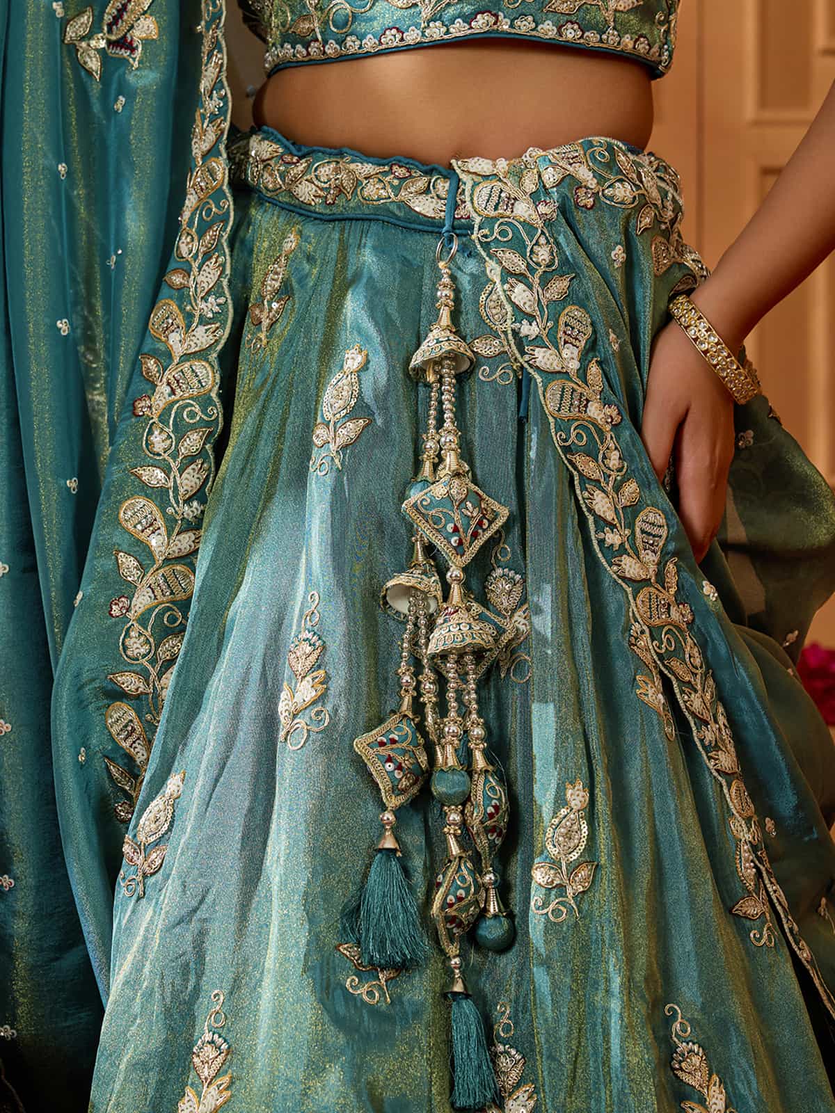 Lehenga:- Made of premium quality Green Color with Tissue fabric Full Flaire Semi-Stitched Lehenga With Sequins and stone and Coding work has a thread Embroidery work. Has a thread cutwork border on the hemline.