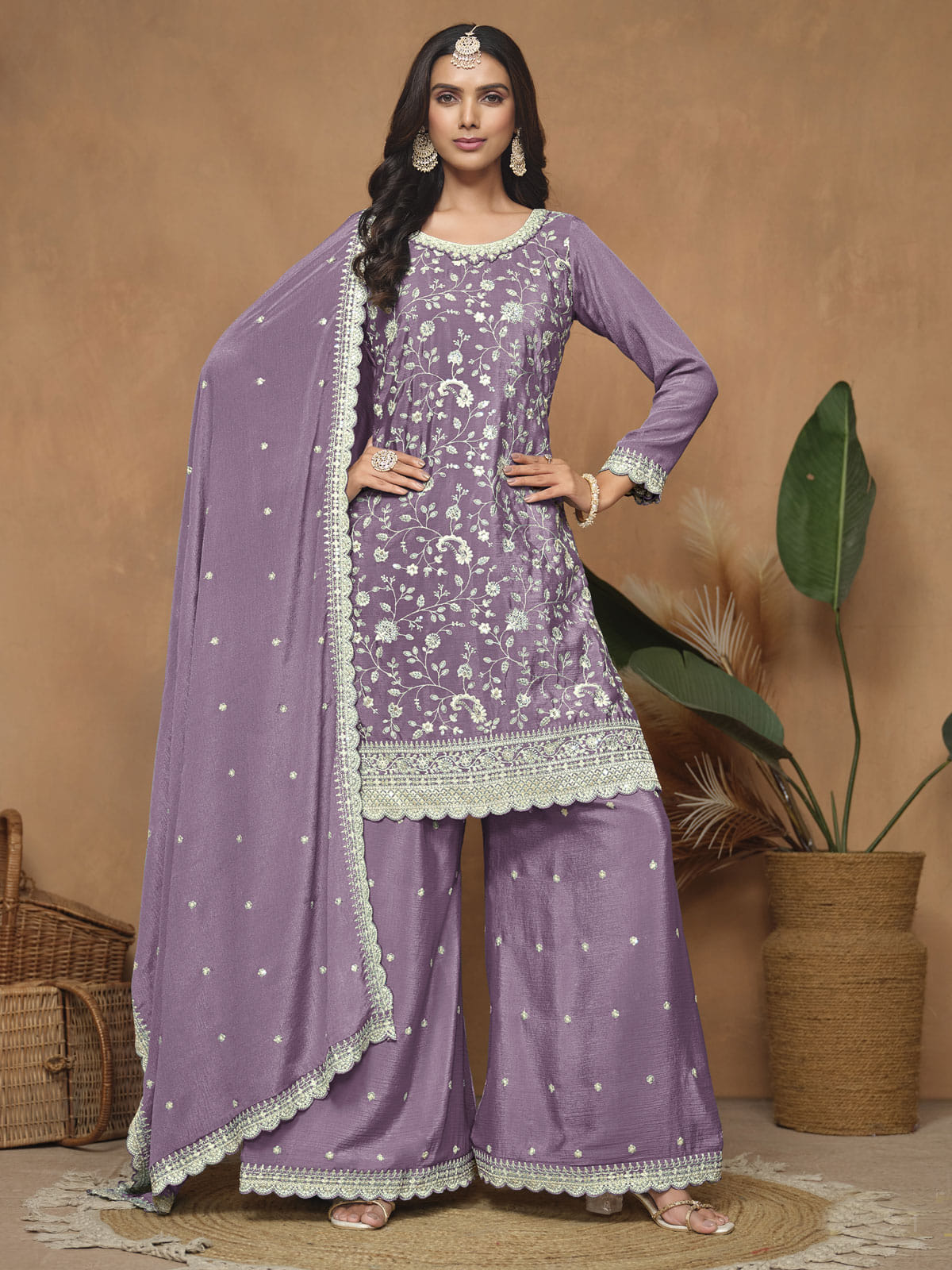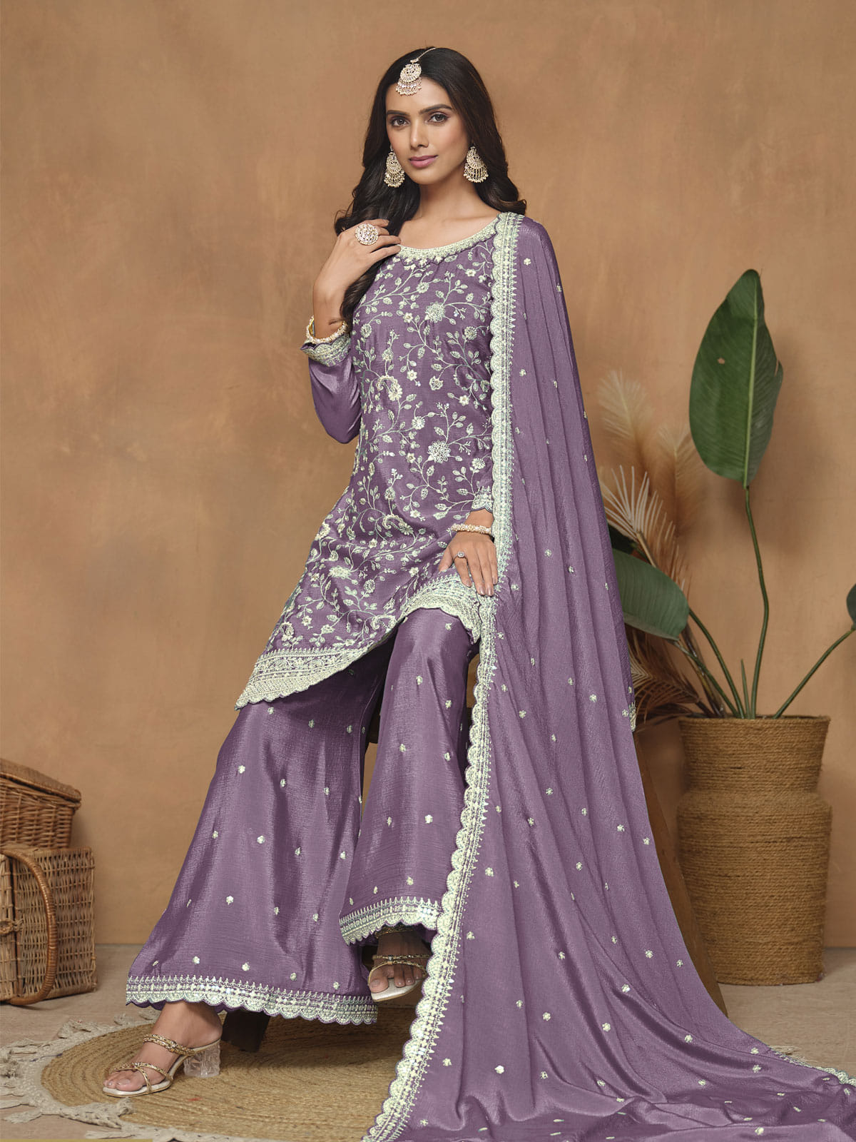Be the life of the wedding or festival in this stunning Purple Chinnon Resham & Sequins Embroidered Palazzo Suit by Empress. The eye-catching purple color and intricate resham thread & sequins embroidery will make you stand out. Complete the look with traditional jewelry and accessories. Comes with matching dupatta & palazzo bottom!