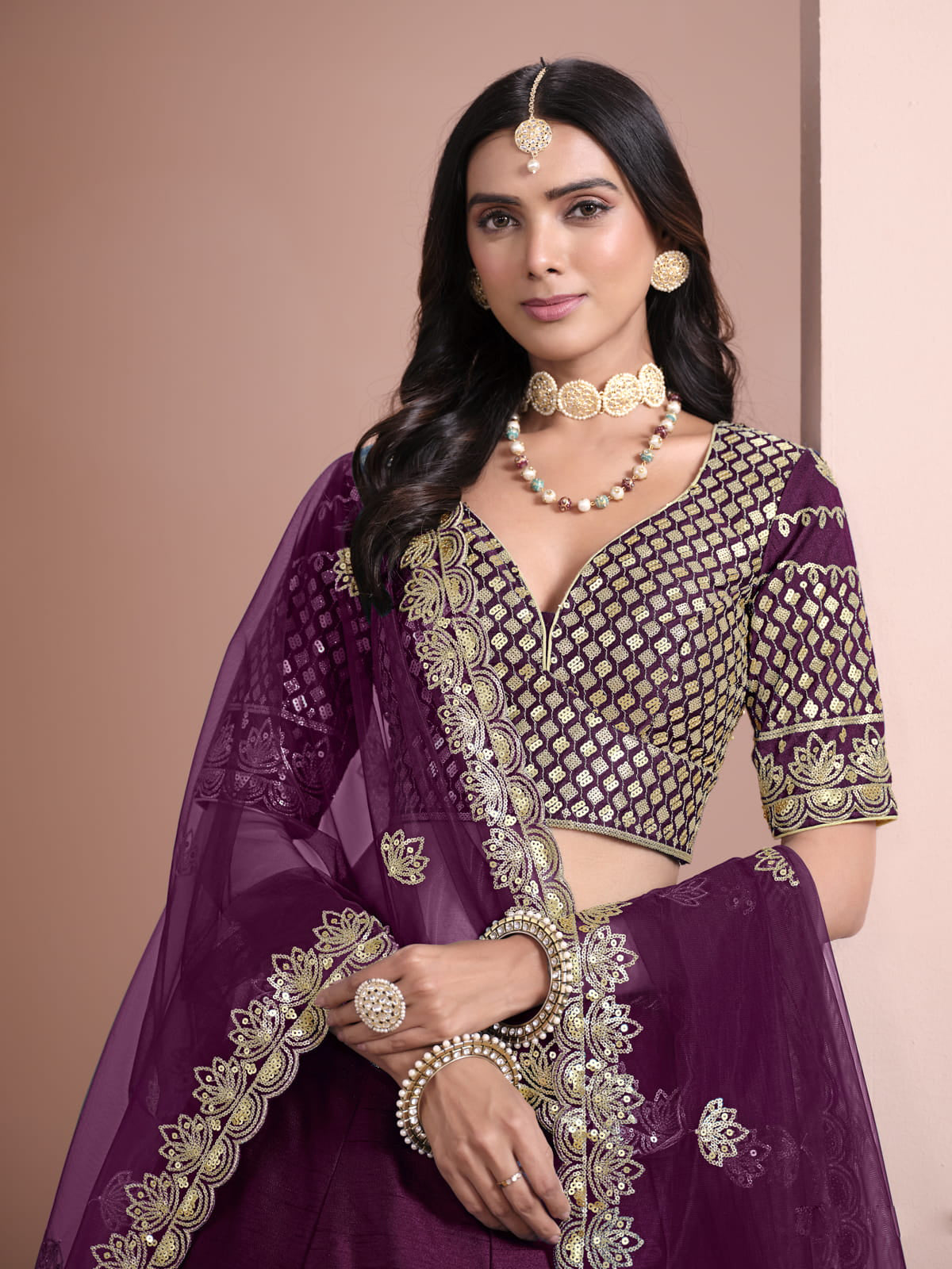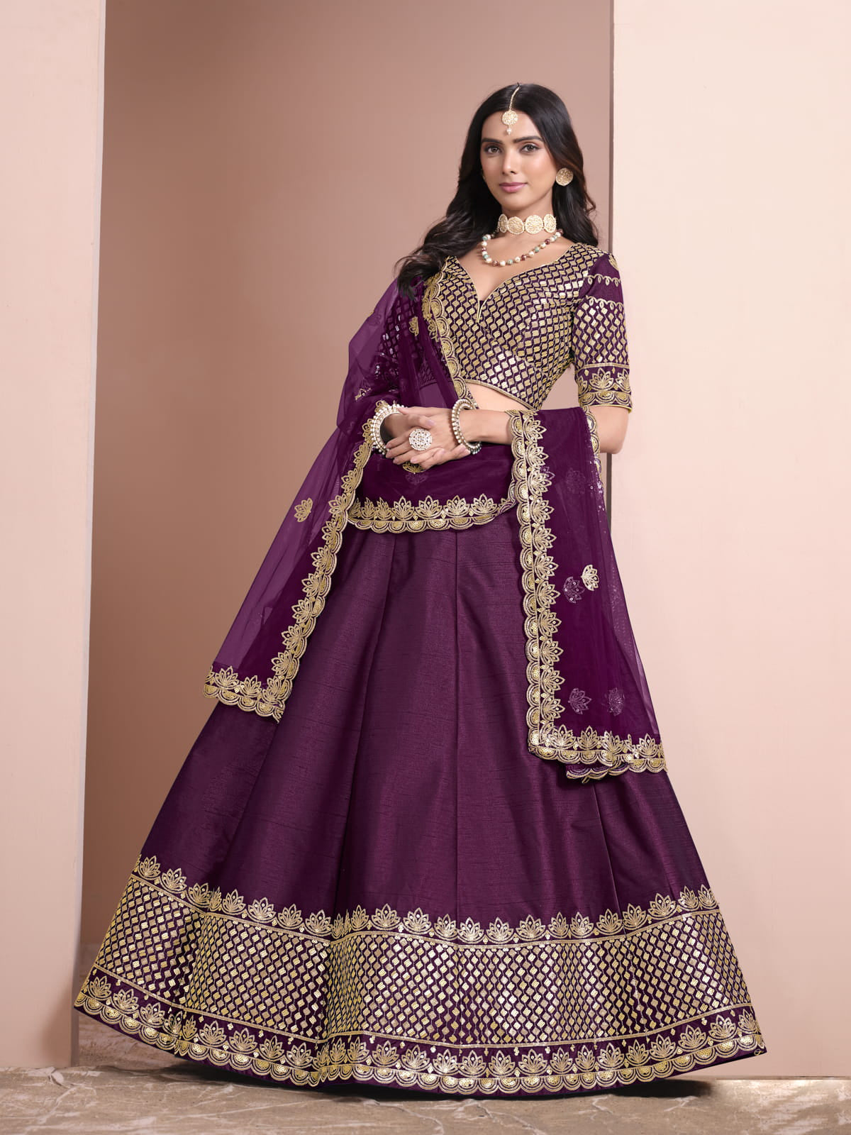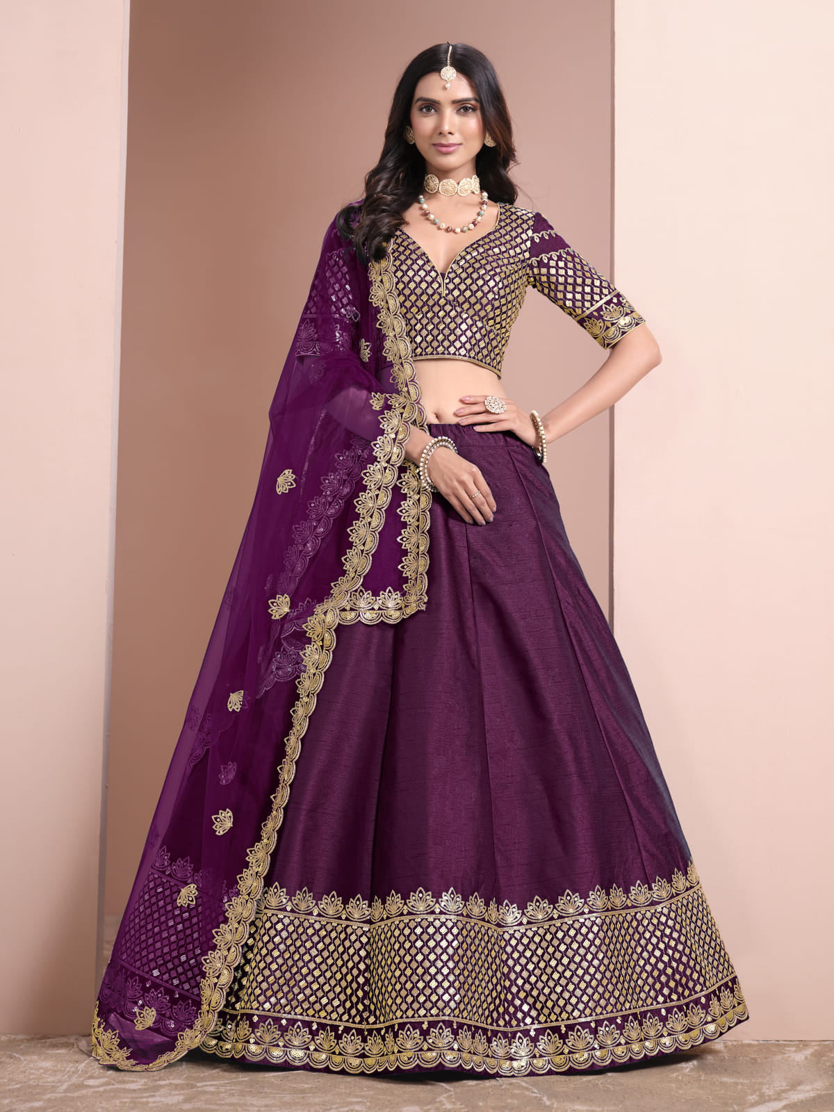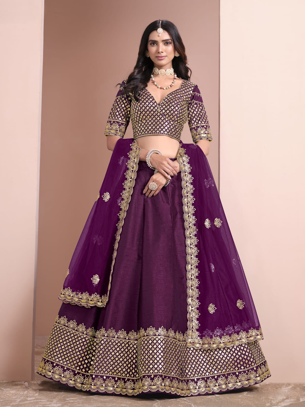 Achieve an elegant look with the Inddus Festive Art Silk Purple Color Embroidered Lehenga Choli. This exquisite lehenga boasts intricate thread embroidery and shimmering sequins, making it perfect for festive and wedding occasions. Lightweight net fabric creates a graceful silhouette, while the included blouse and dupatta complete the regal ensemble. Pair with traditional accessories for a timeless and glamorous look.