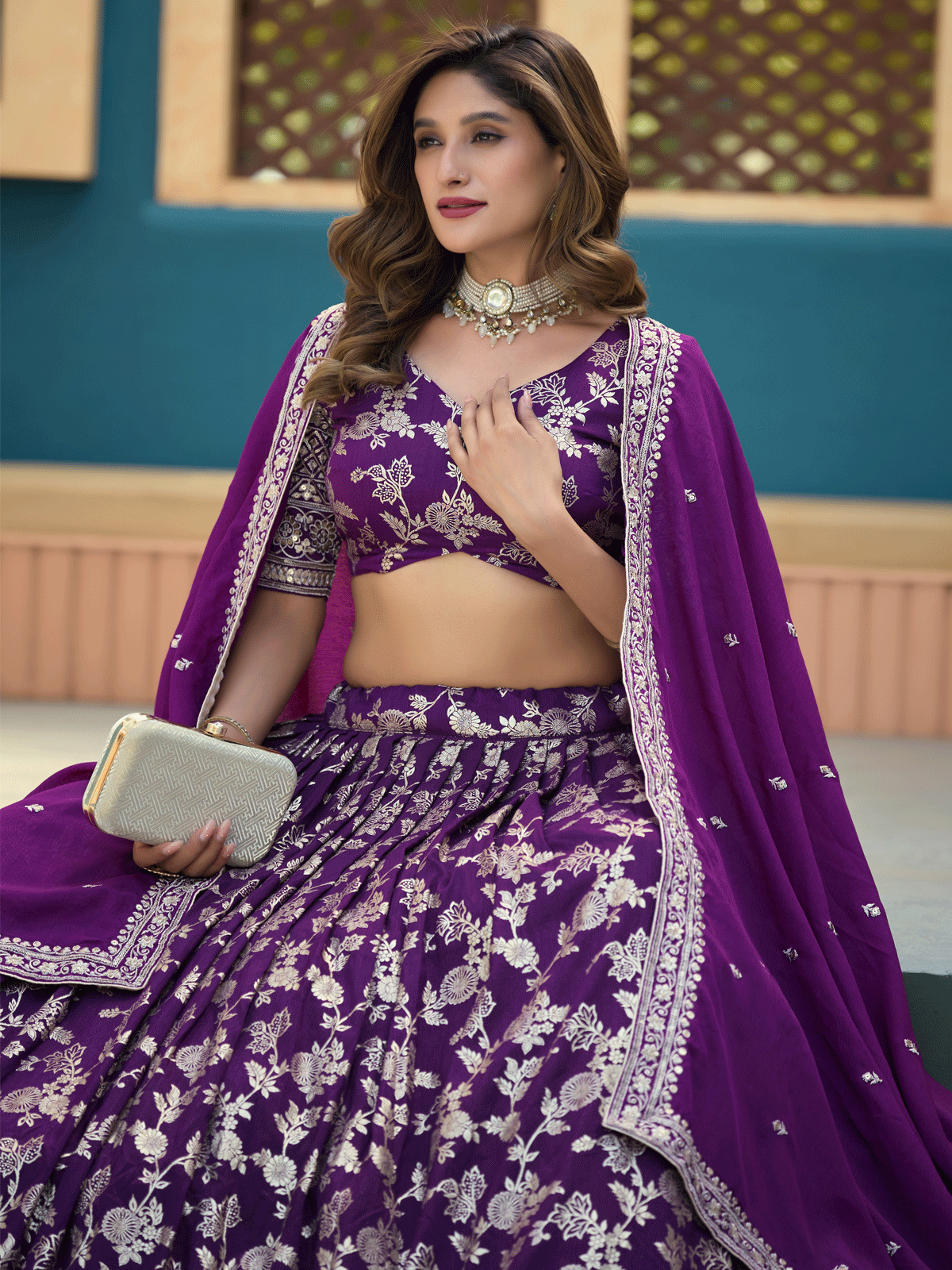 Embrace timeless sophistication in this Purple Dola Silk Jacquard Lehenga Choli from Inddus. Crafted from premium dola silk, this piece showcases exquisite jacquard weaving enhanced with intricate thread and sequins embroidery that catches light beautifully. The meticulous detailing delivers authentic traditional craftsmanship perfect for weddings and festive celebrations. The luxurious fabric drapes elegantly while the ornate embellishments create a striking visual impact. Ideal for those seeking refined ethnic wear that combines heritage artistry with contemporary styling, this lehenga choli makes a distinguished statement at any special occasion.