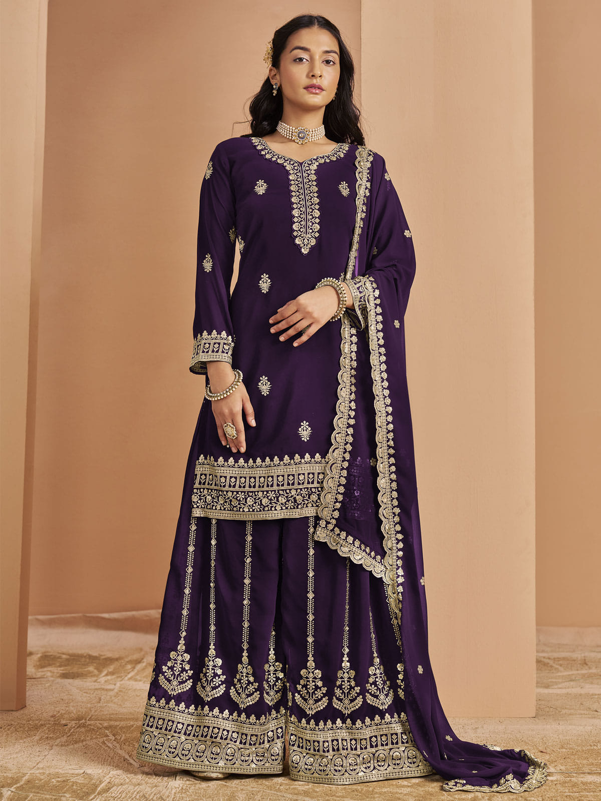 Elevate your style with this Purple Festive Style Embroidered Palazzo Suit. The delicate thread and sequin embroidery, lightweight faux georgette fabric, and vibrant purple color make for a stunning visual impact. Graceful flow, modern sophistication, and comfort- all in one ensemble, perfect for weddings and festivities.