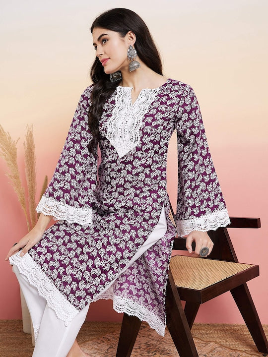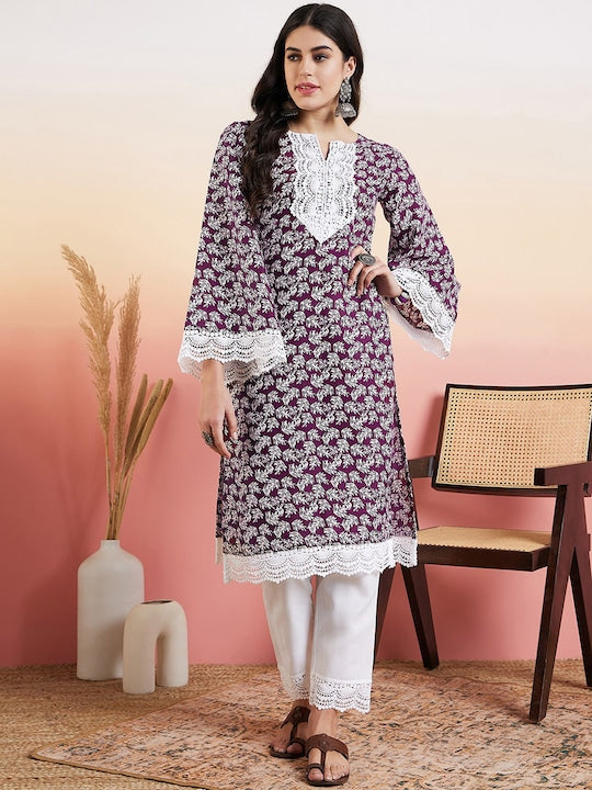 This Purple Floral Printed Thread Work Straight Kurta is perfect for any occasion. The beautiful floral print in purple and white adds a touch of elegance, and the notched neck and long, flared sleeves give it a trendy yet comfortable look. The straight shape and calf length make it a versatile piece, while the thread work detail adds a delicate touch. Made from regular machine-woven cotton, this kurta is both stylish and easy to care for.