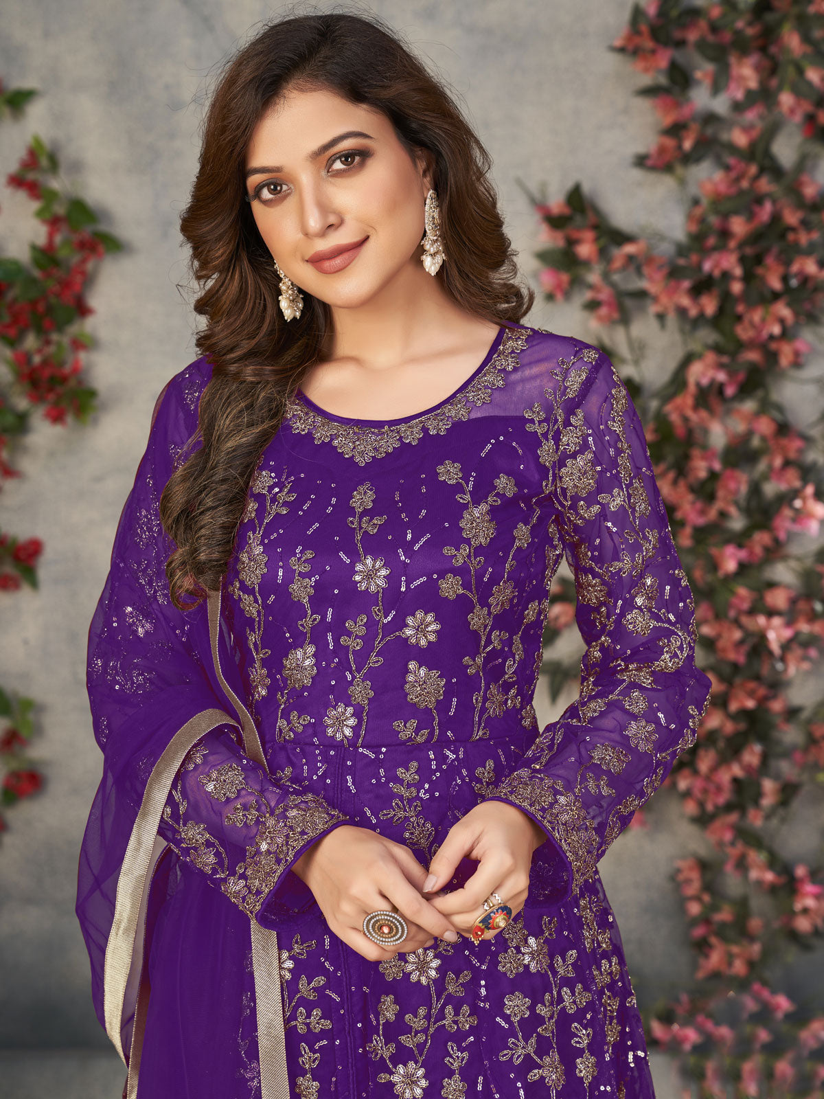 Elevate your festive wardrobe with this exquisite purple Anarkali suit, where traditional craftsmanship meets modern elegance. The flowing A-line silhouette features a dramatic high slit that adds contemporary flair to this timeless design. Adorned with intricate embroidery and luminous sequin detailing, the delicate net fabric captures light beautifully, creating a mesmerizing effect perfect for weddings and celebrations. Every stitch reflects meticulous artistry, blending ornate coding work with refined sophistication. This piece transcends seasonal wear, offering a versatile statement that honors heritage while embracing current fashion sensibilities, making it an essential addition for those who appreciate curated, occasion-worthy pieces.