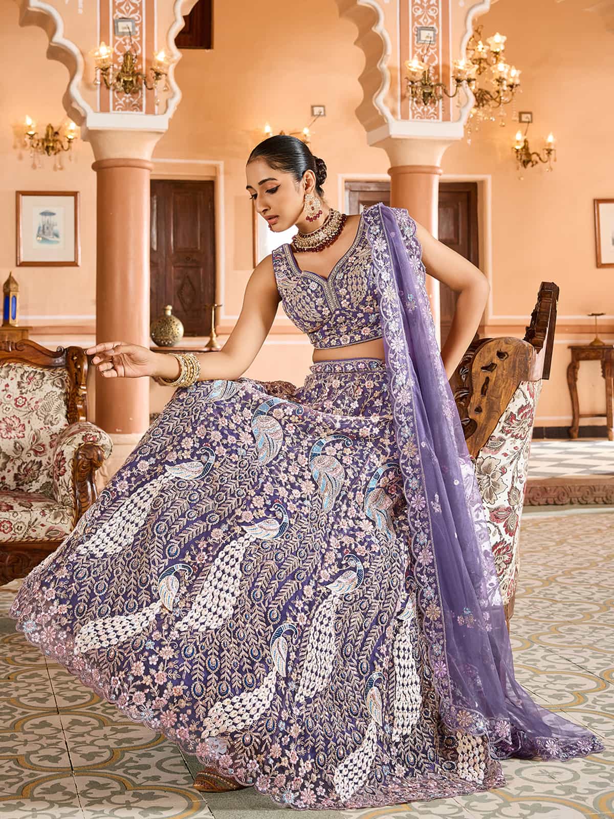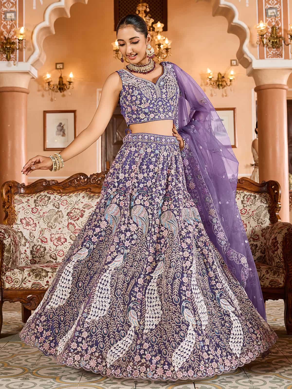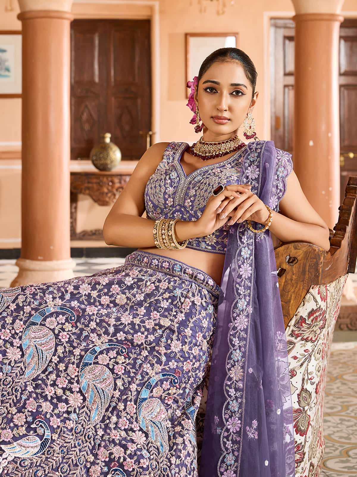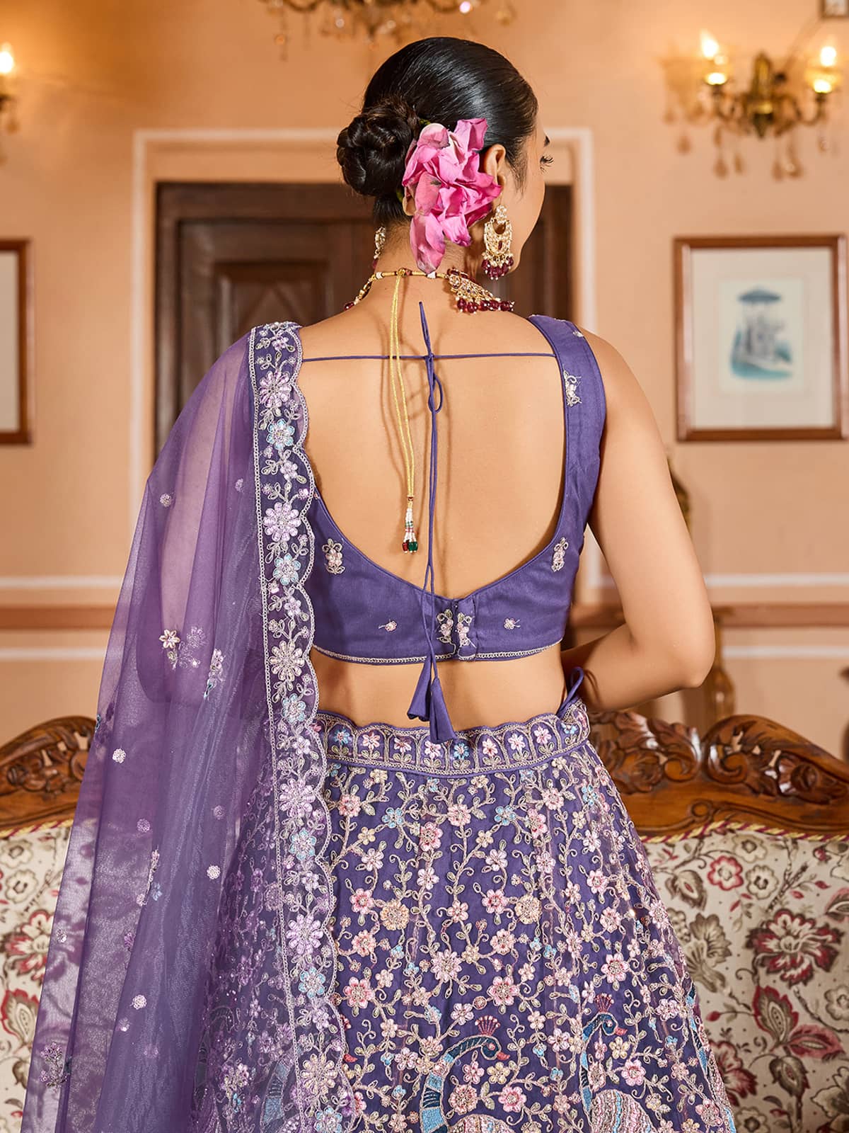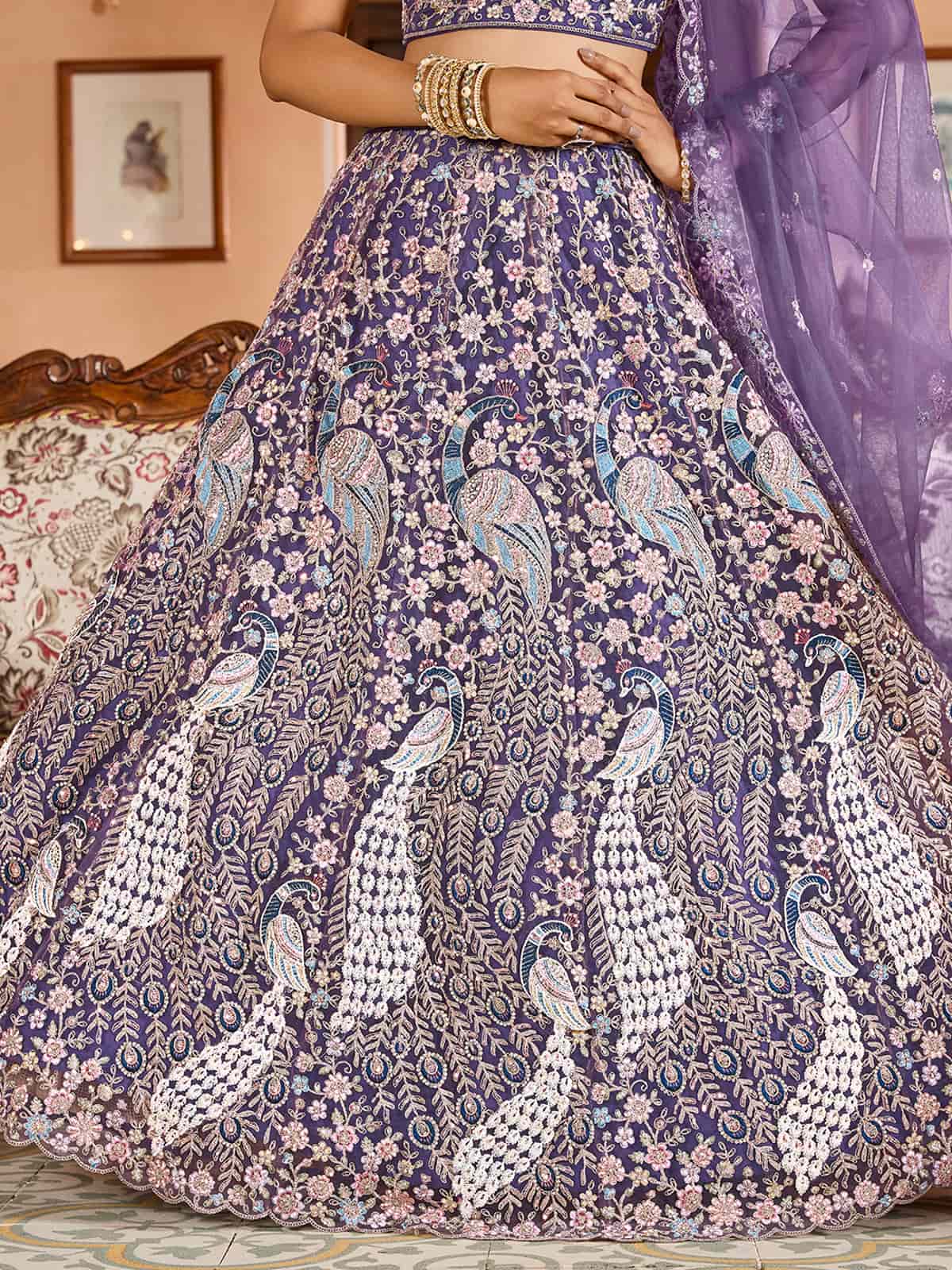 Crafted from luxurious purple net fabric, this semi-stitched lehenga features intricate sequin embroidery, stone detailing, and refined thread cutwork along the hemline. The voluminous 3.5-meter flare is supported by a structured inner comprising single shantoon lining with 18-inch Can Can and dual layers of buckram for optimal drape and movement. The coordinating purple net dupatta showcases elaborate coding and embroidered borders for added elegance. The sweetheart-neckline blouse is adorned with heavy sequins, coding, and thread embroidery work, complete with attached shantoon lining for comfort. This ensemble combines traditional craftsmanship with contemporary design, offering a sophisticated choice for festive occasions.