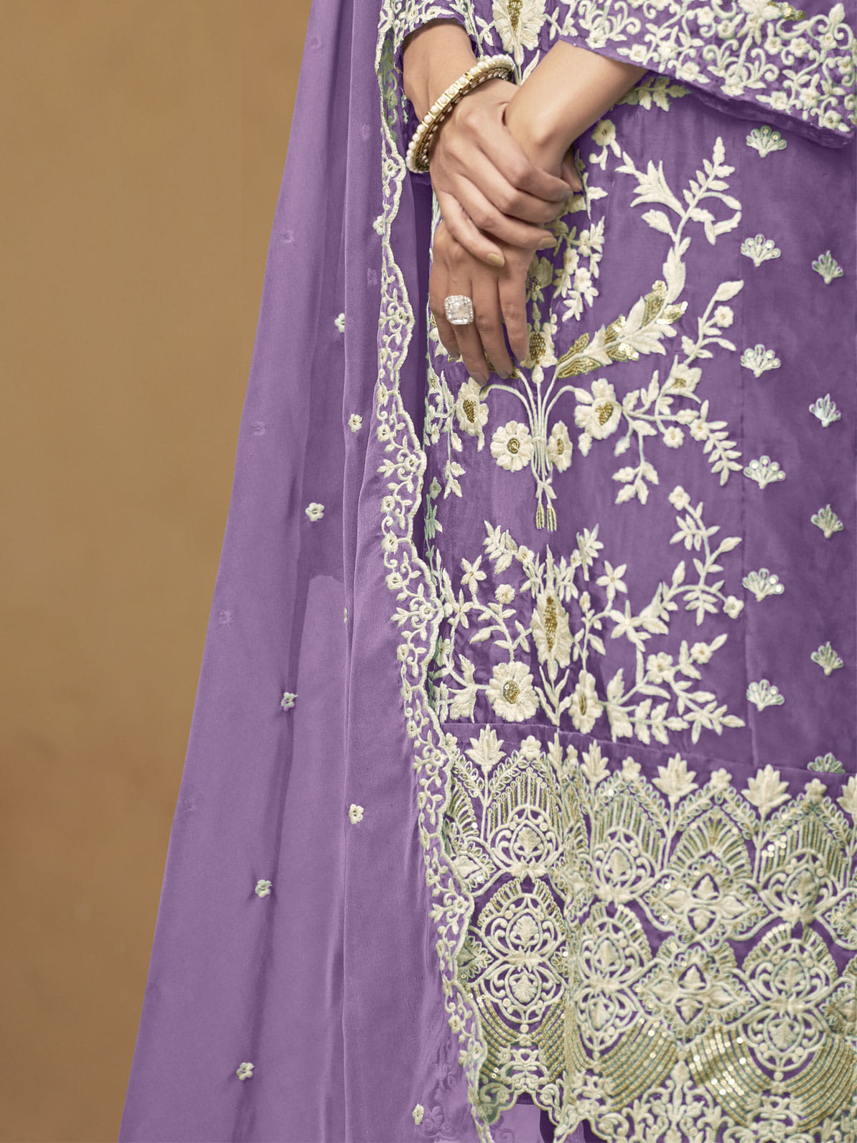 Our Purple Organza Embroidered Designer Salwar Suit will elevate your traditional look with its intricate embroidery and high-quality organza material. Perfect for weddings, formal events, and family gatherings, this suit offers both style and comfort. Complete the look with matching bottom and organza dupatta and traditional jewelry for a stunning finish.