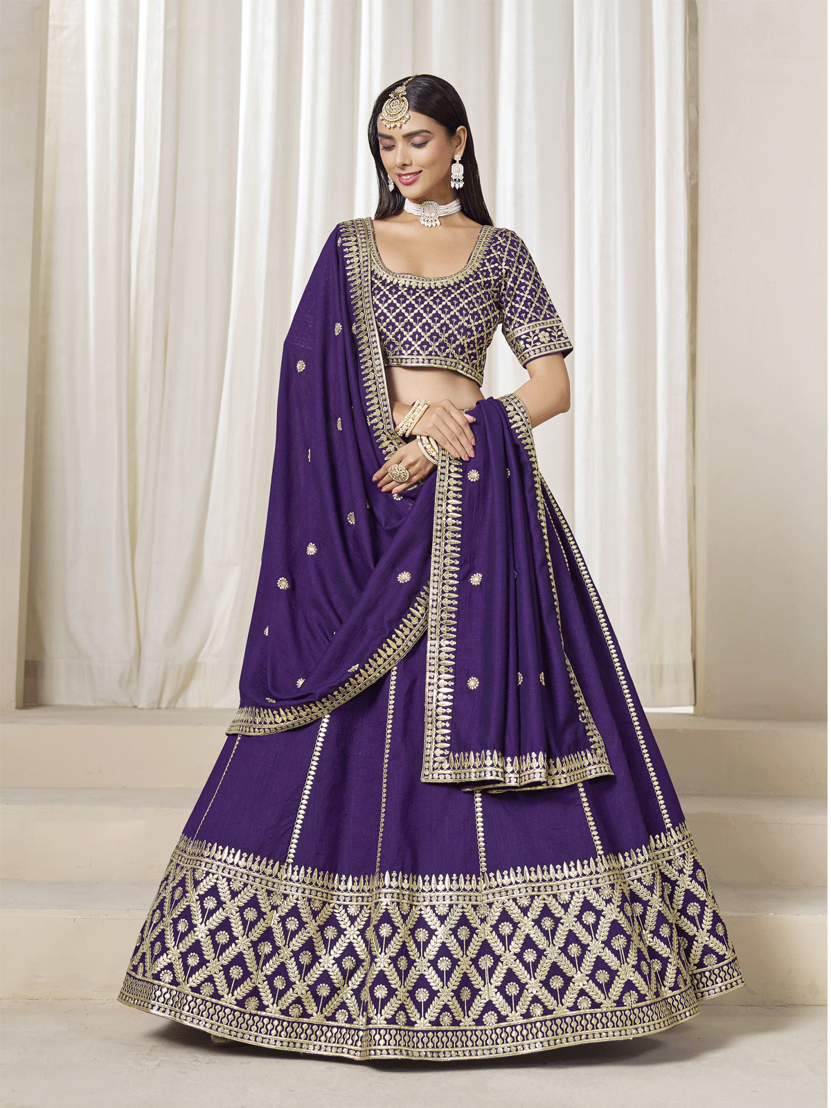 This exquisite umbrella lehenga choli set showcases traditional craftsmanship in luxurious art silk. The lehenga features an expansive floor-length umbrella cut with intricate zari and gota embroidery adorning its voluminous flare, creating graceful movement with every step. The natural waistline is secured by a drawstring closure for comfortable wear. The matching art silk blouse presents a contemporary U-neckline with a daring low front and deeply cut back, complemented by half sleeves and ornamental dori tie-ups. Back hook fastening ensures secure closure. The rich purple hue combined with shimmering embellishments makes this set an ideal choice for weddings and festive celebrations, delivering both elegance and authentic ethnic appeal.
