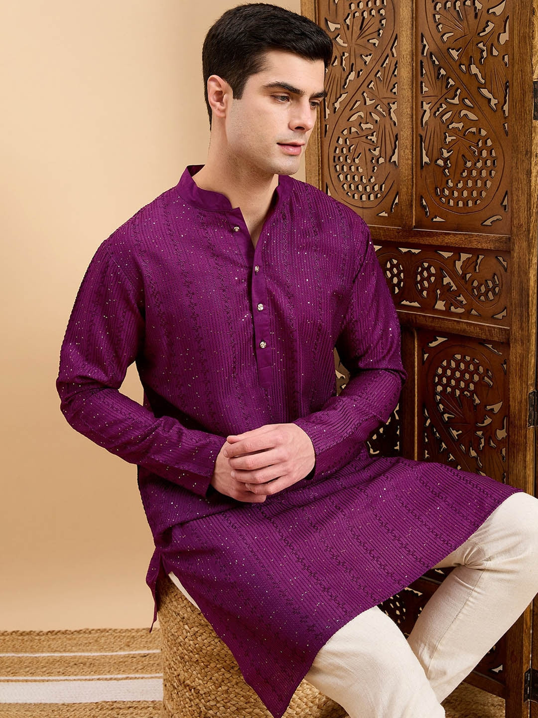 This purple embroidered mandarin collar kurta features a stylish striped design, accented with intricate bead and stone detailing. Crafted from high-quality, machine-woven cotton, it boasts long, regular sleeves and a straight shape with a knee-length hem. Elevate your wardrobe with this elegant and versatile piece.